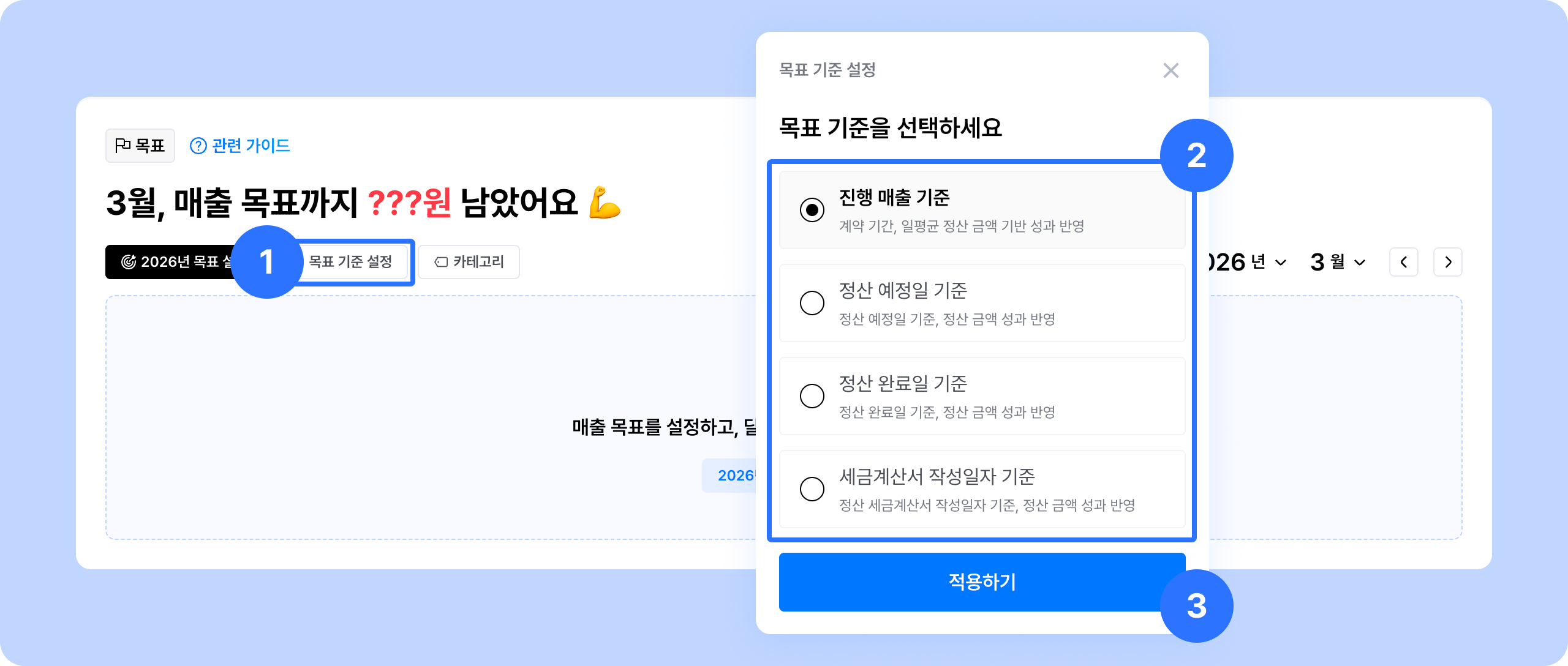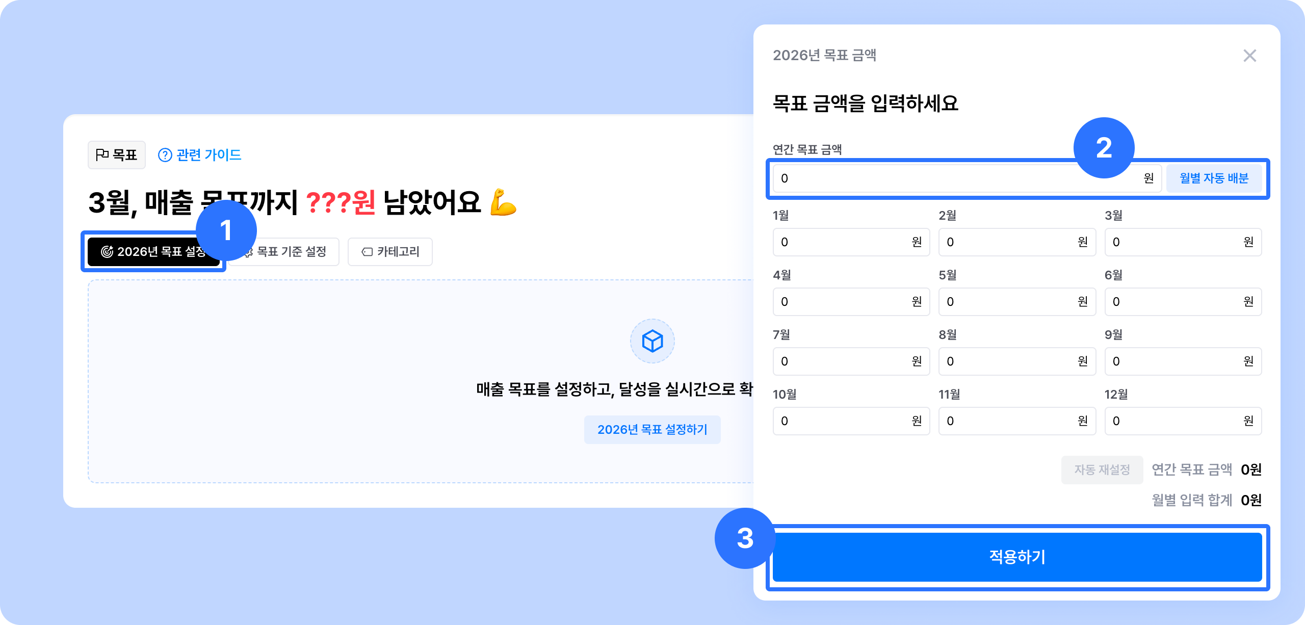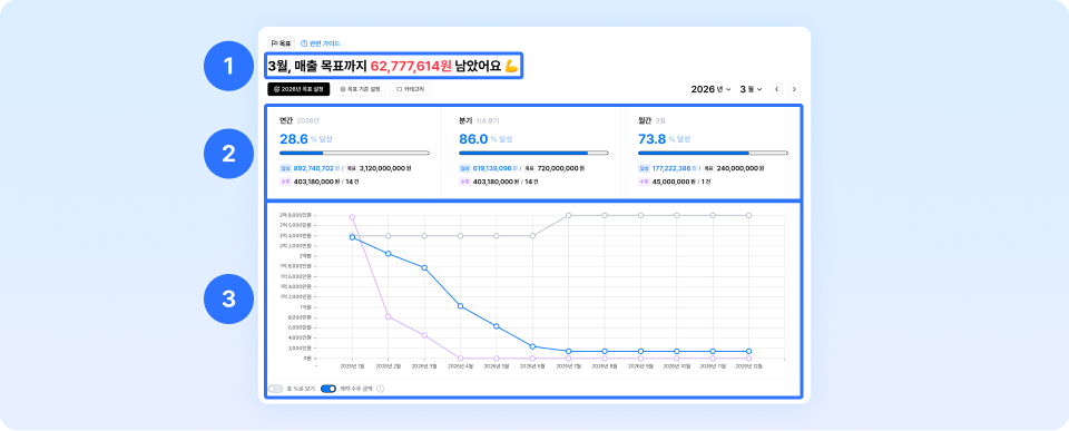 ① 현재 보고 있는 기준 월의 매출 목표까지 금액을 확인할 수 있어요.