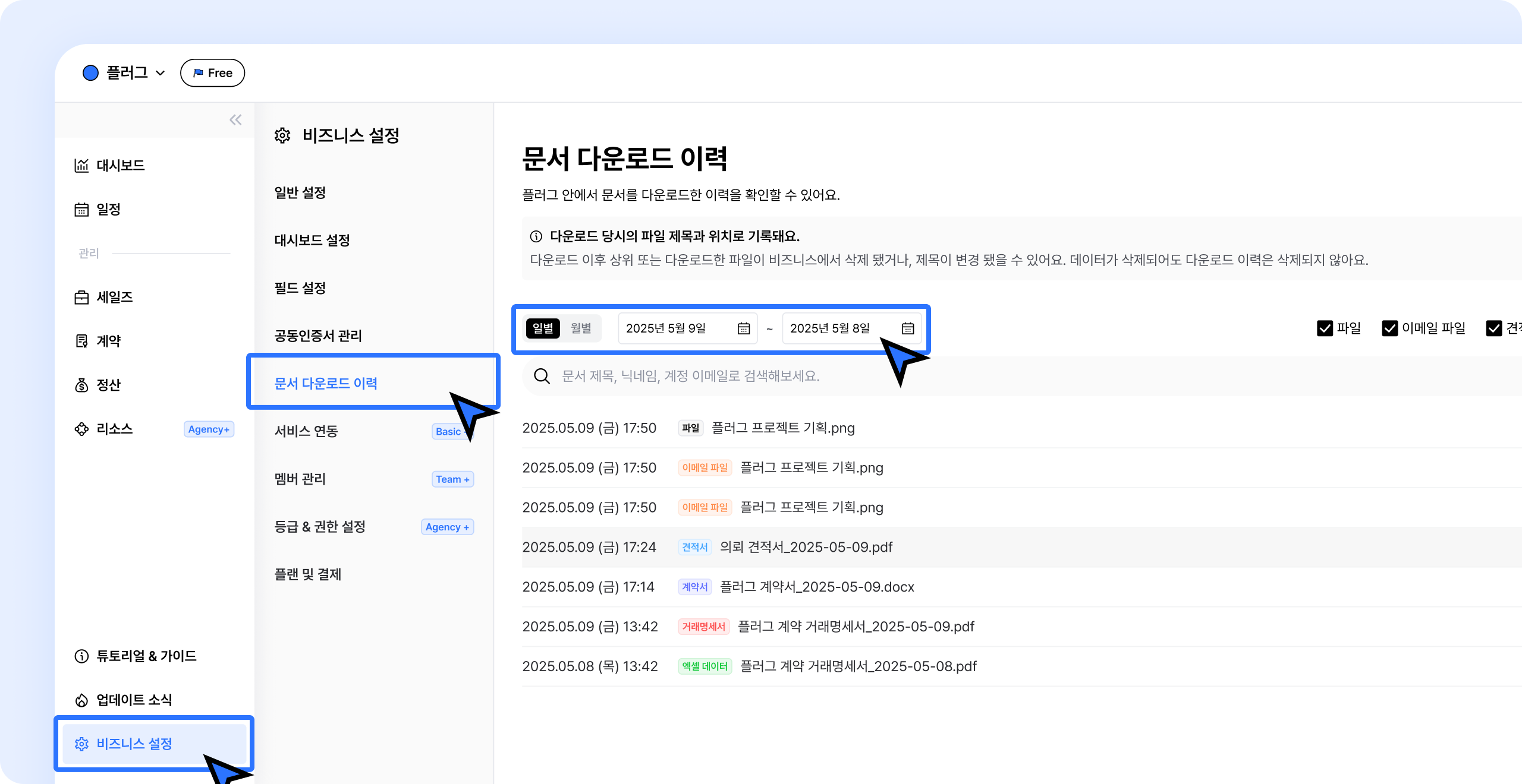 Agency플랜: '문서 다운로드 이력 보기' 권한이 있는 경우, 확인할 수 있어요.