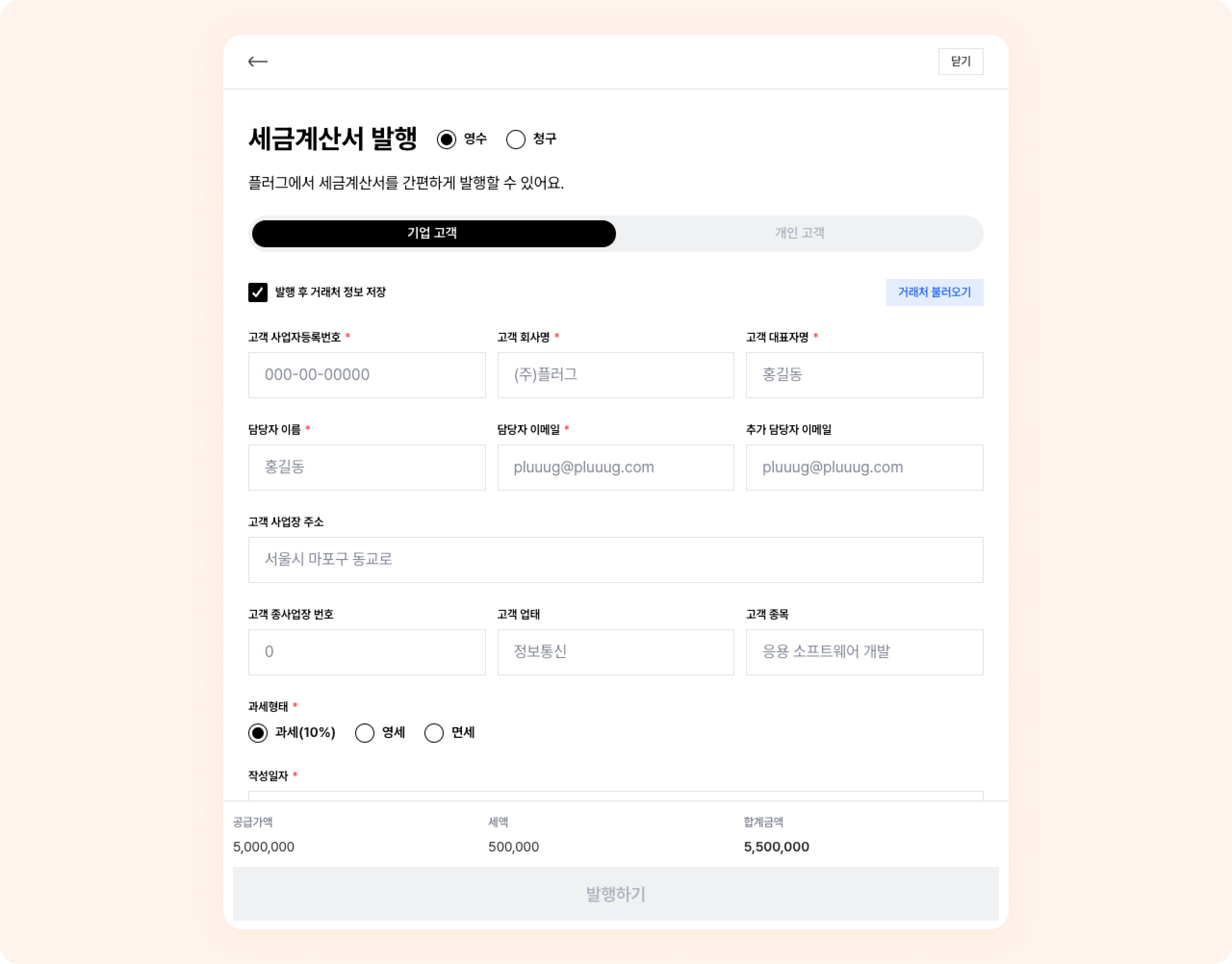 세금계산서를 발행하세요.기업 고객과 개인 고객을 선택해 발행할 수 있어요.