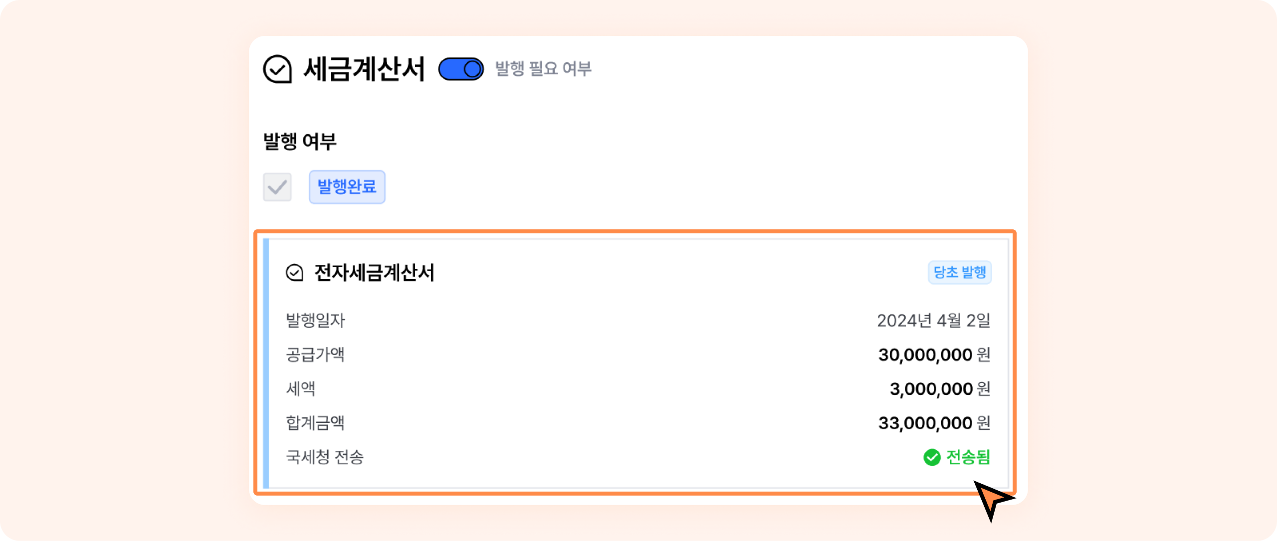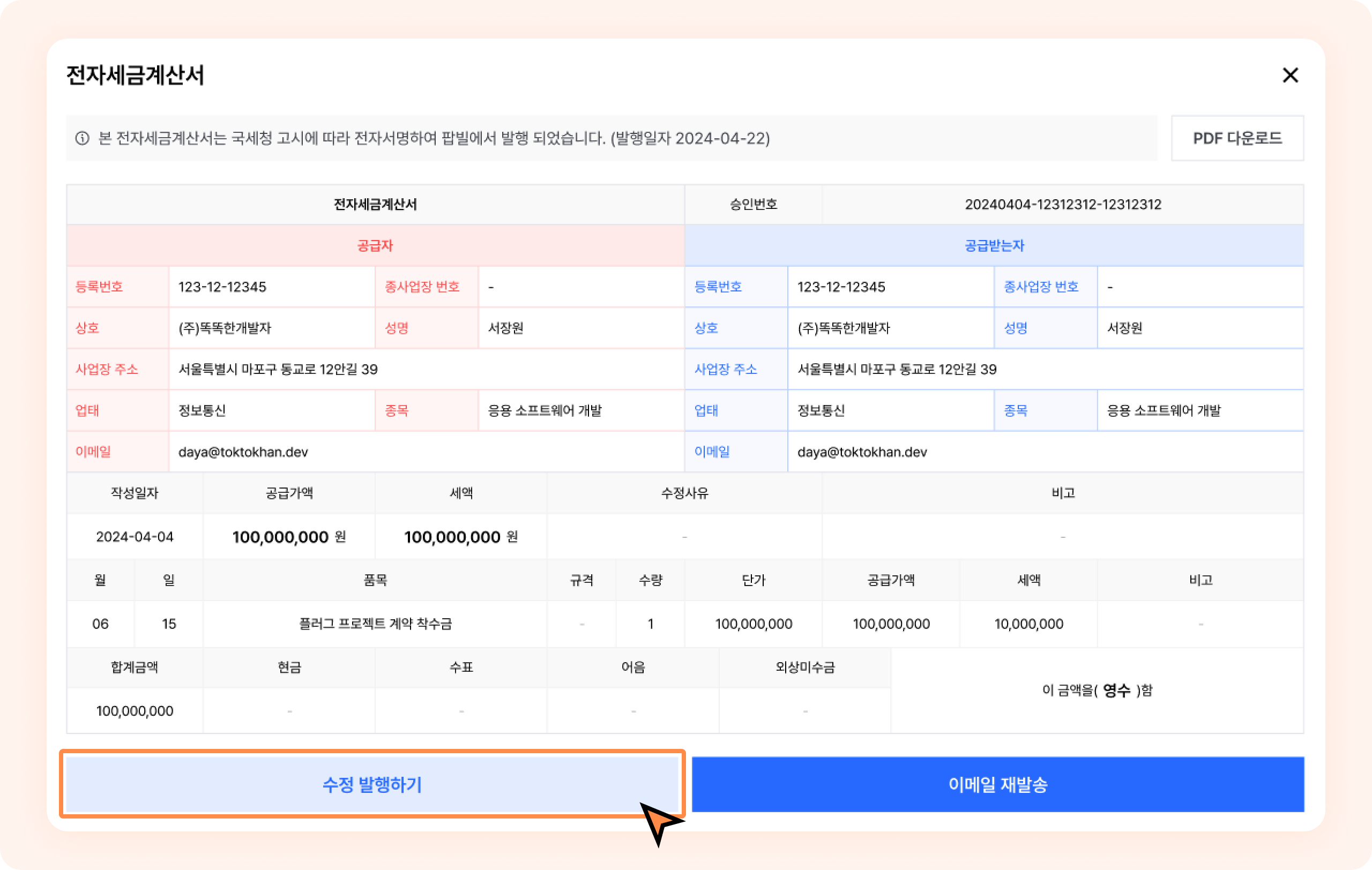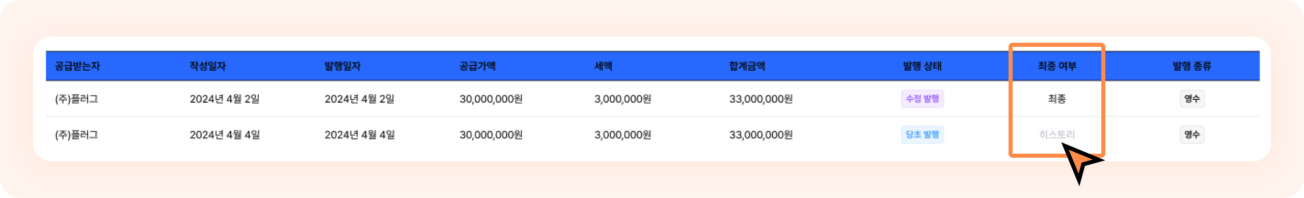 수정 발행을 완료하면, 세금계산서 페이지에서 어떤 건이 최종 발행 건인지 확인할 수 있어요.