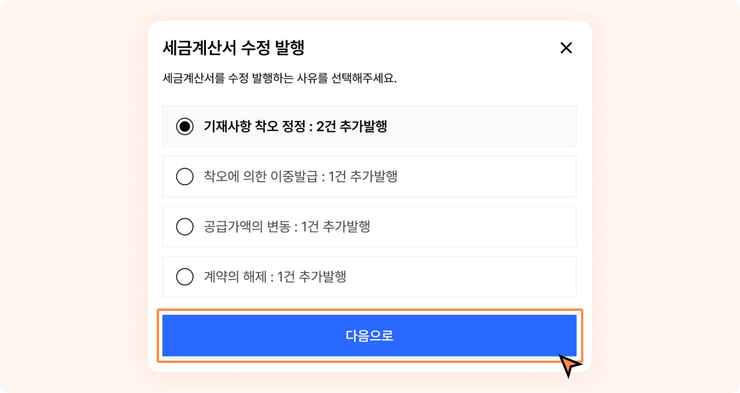 수정 발행 사유를 선택하고,다음으로버튼을 클릭하세요.