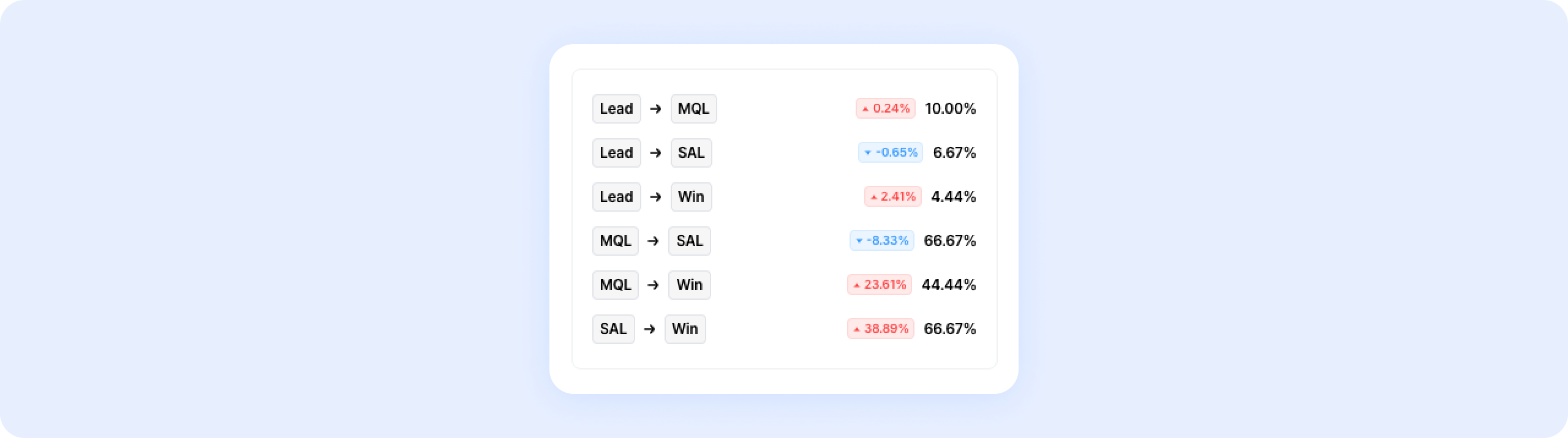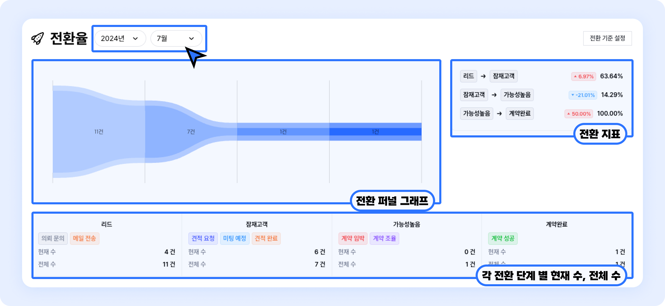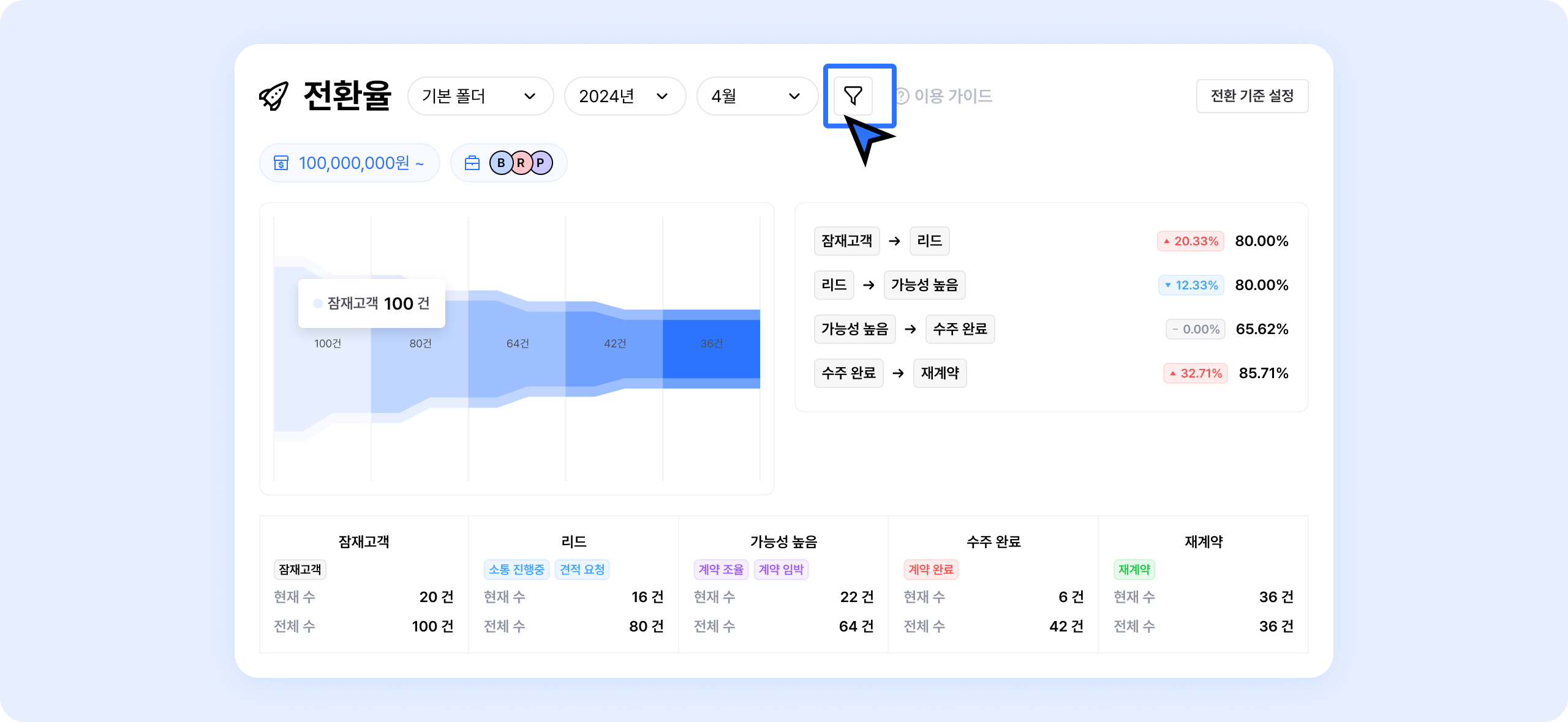 만약 지난 달 [유입] → [1차미팅] 까지의 전환이 30%였다면, 이번 월에는 35%를 목표로 올려보자는 목표를 세우고 그에 맞는 액션을 설계할 수 있어요. 실제 영업에서 성과와 능력을 증명하는 지표이기도 해요.