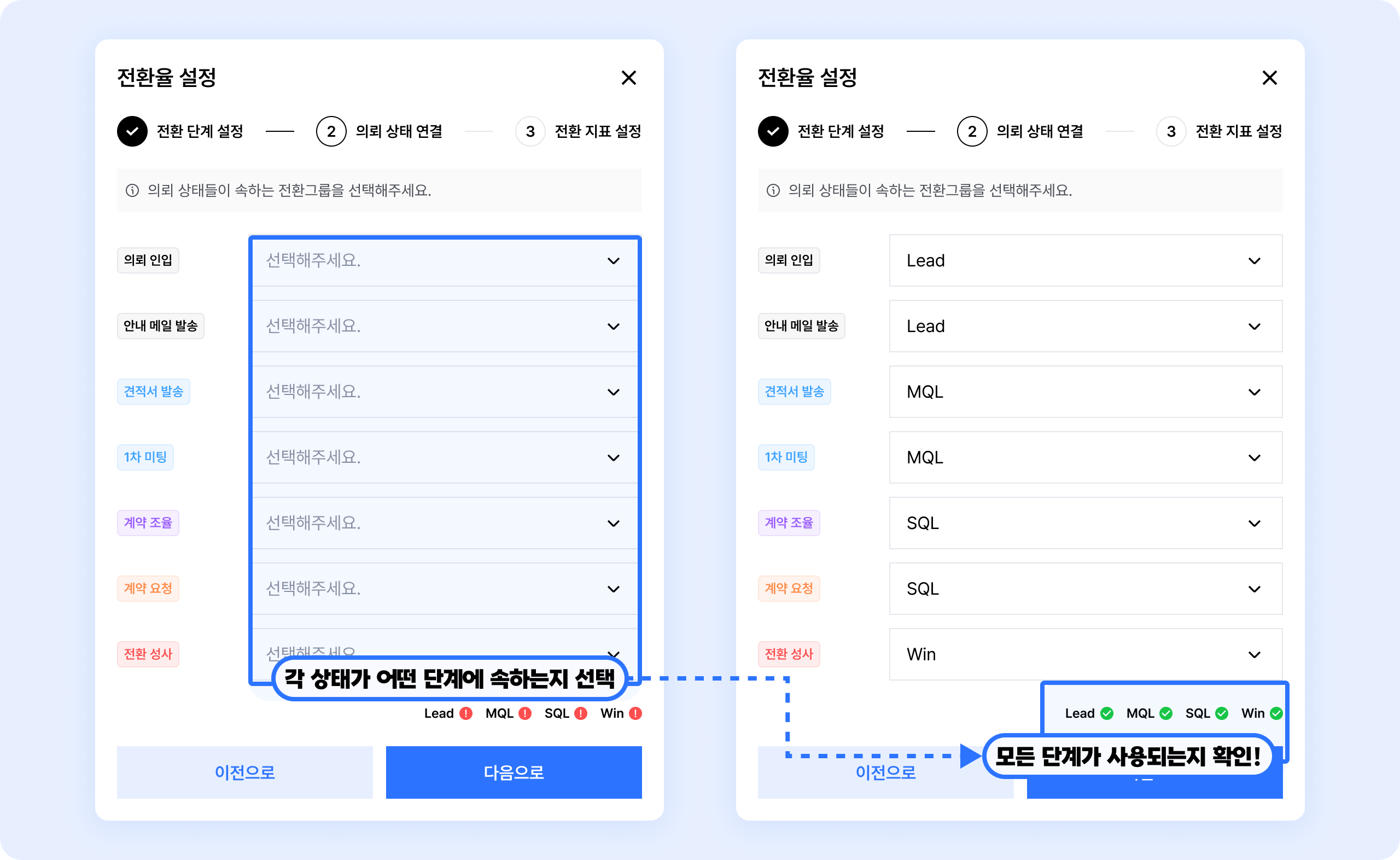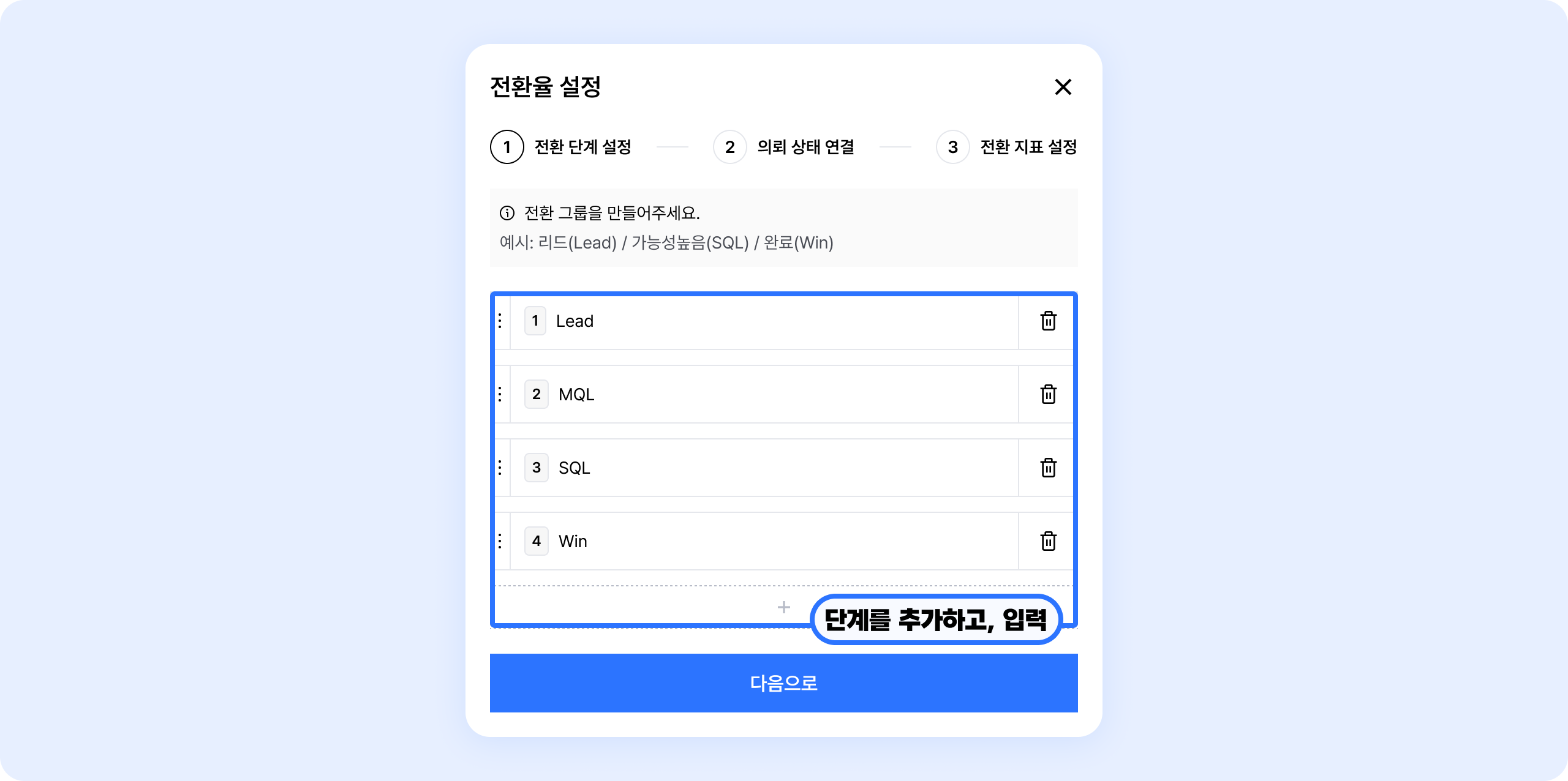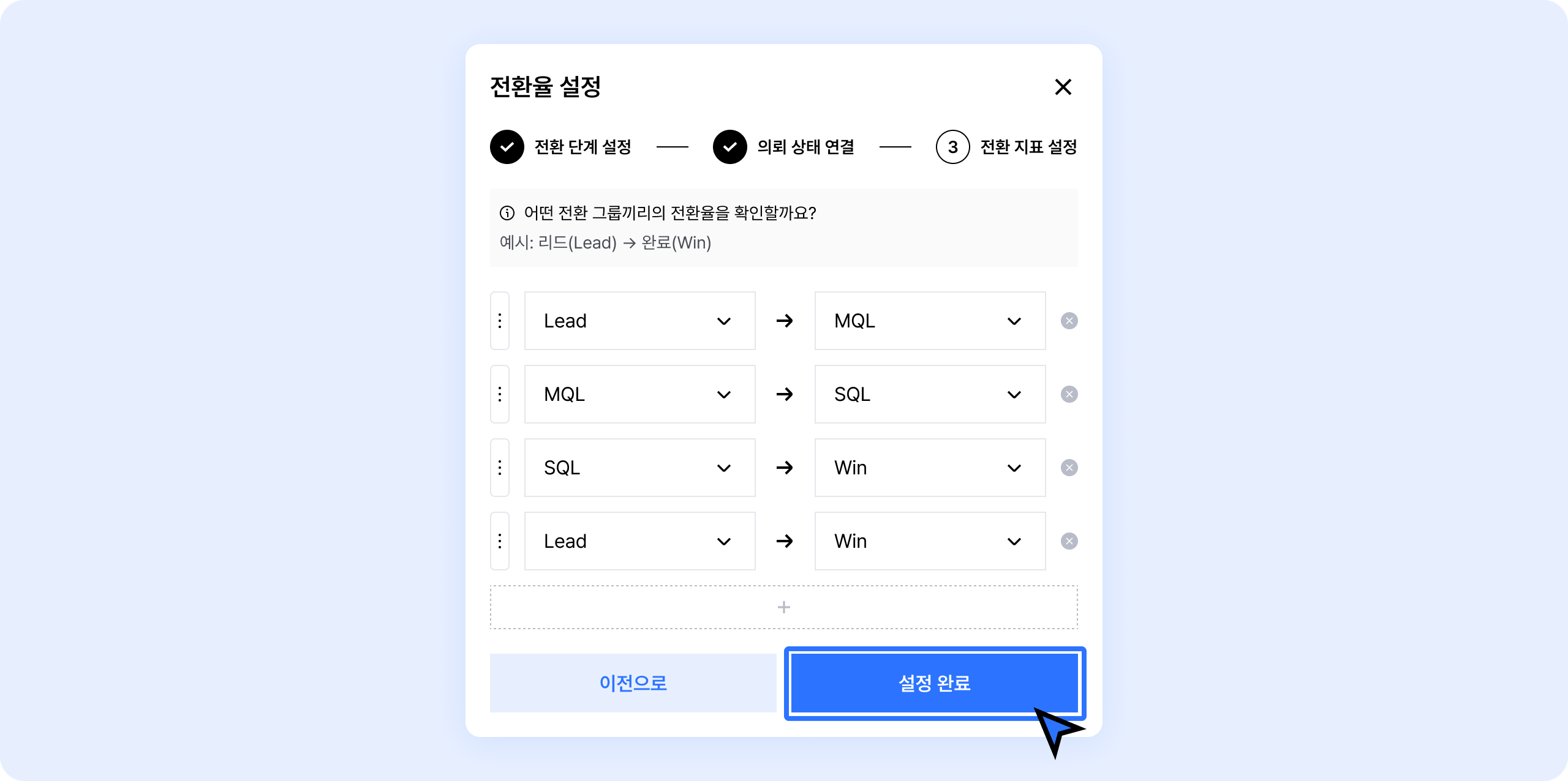 즉, 전환 단계에서는 Lead, MQL, SQL, Win 4가지의 전환 단계를 생성하면 돼요.