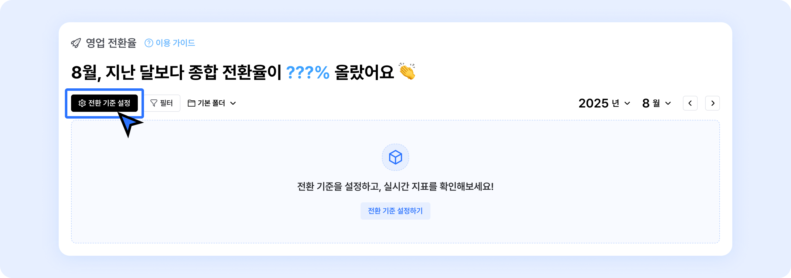 대시보드 전환율 섹션 중앙에 전환 기준 설정하기 버튼 또는 상단 전환 기준 설정 버튼을 클릭하세요.