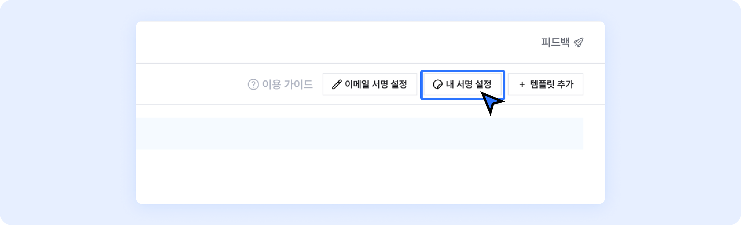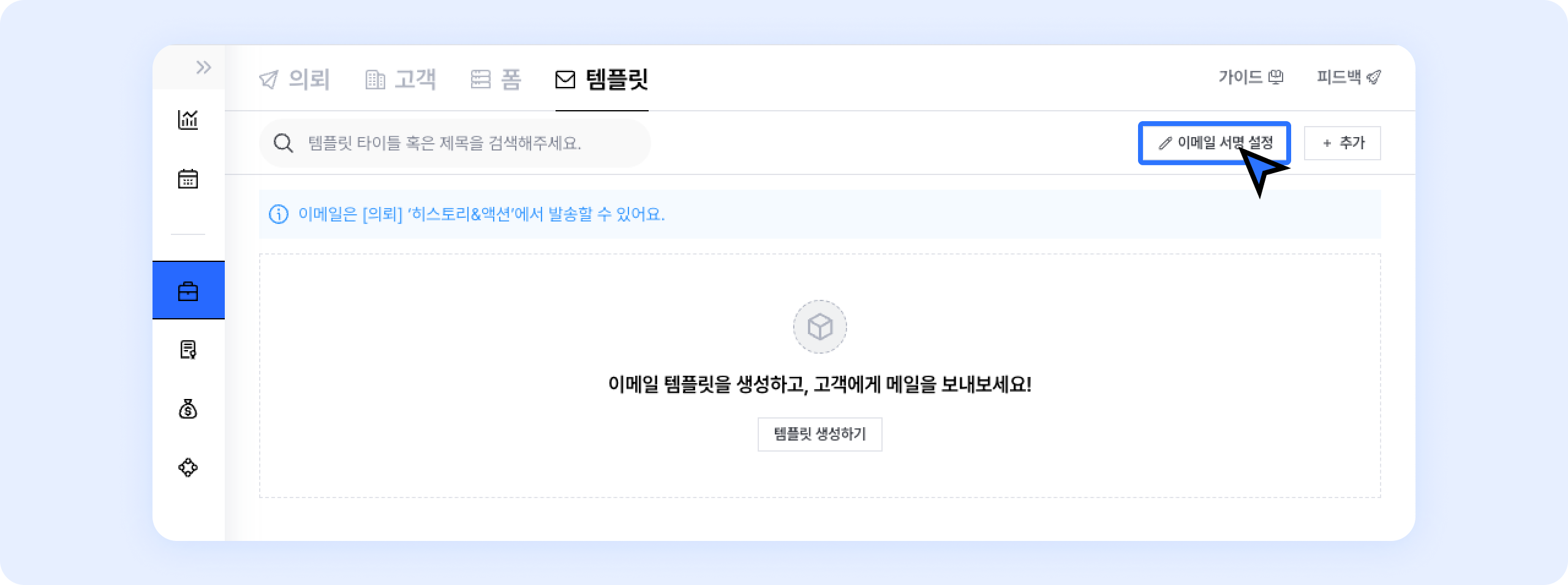 세일즈 > 템플릿 화면에서 이메일 서명 설정 버튼을 클릭하세요.