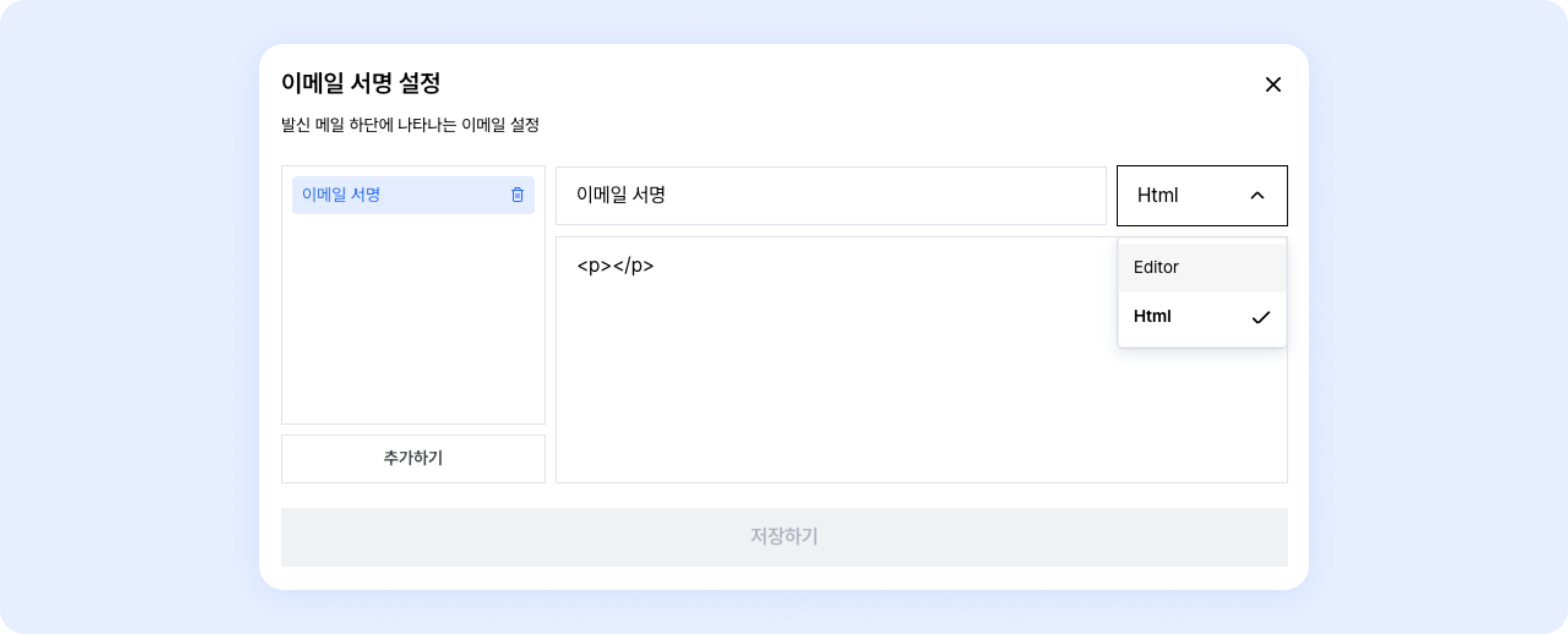 Html 형식의 이메일 서명이 없다면, Editor로 변경하여 자유롭게 서명을 구성하세요.