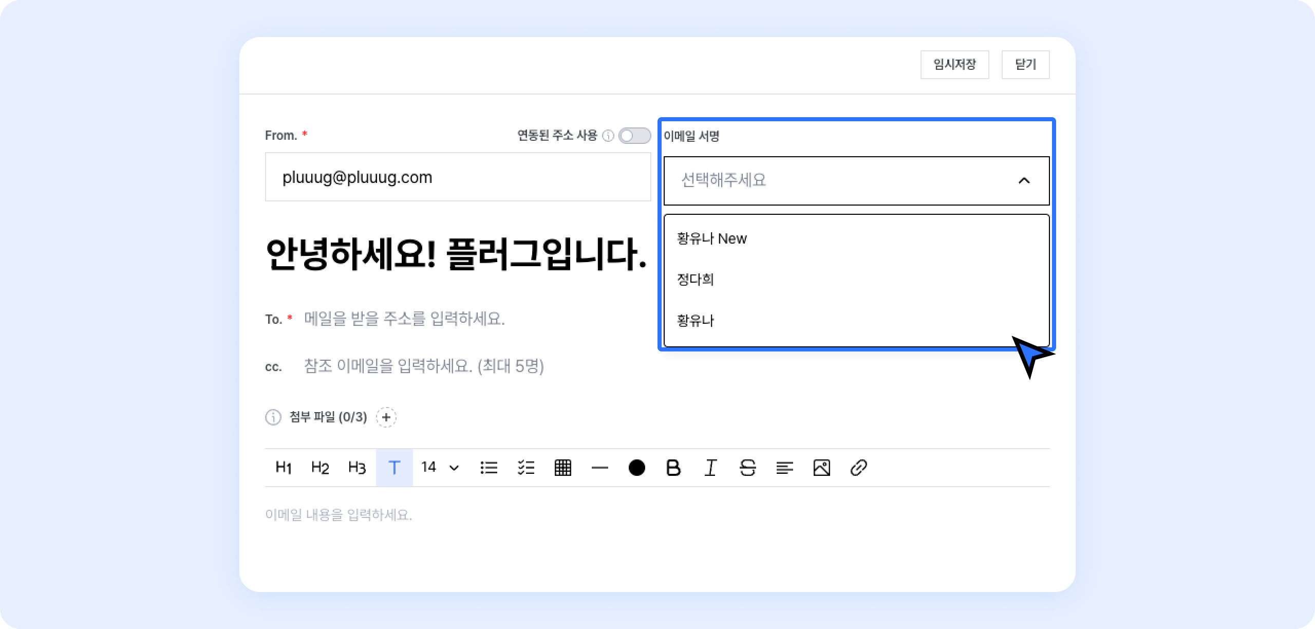 세일즈 > 의뢰 페이지에서 이메일을 발송할 때, 우측 상단 이메일 서명에서 만든 서명을 선택할 수 있어요.