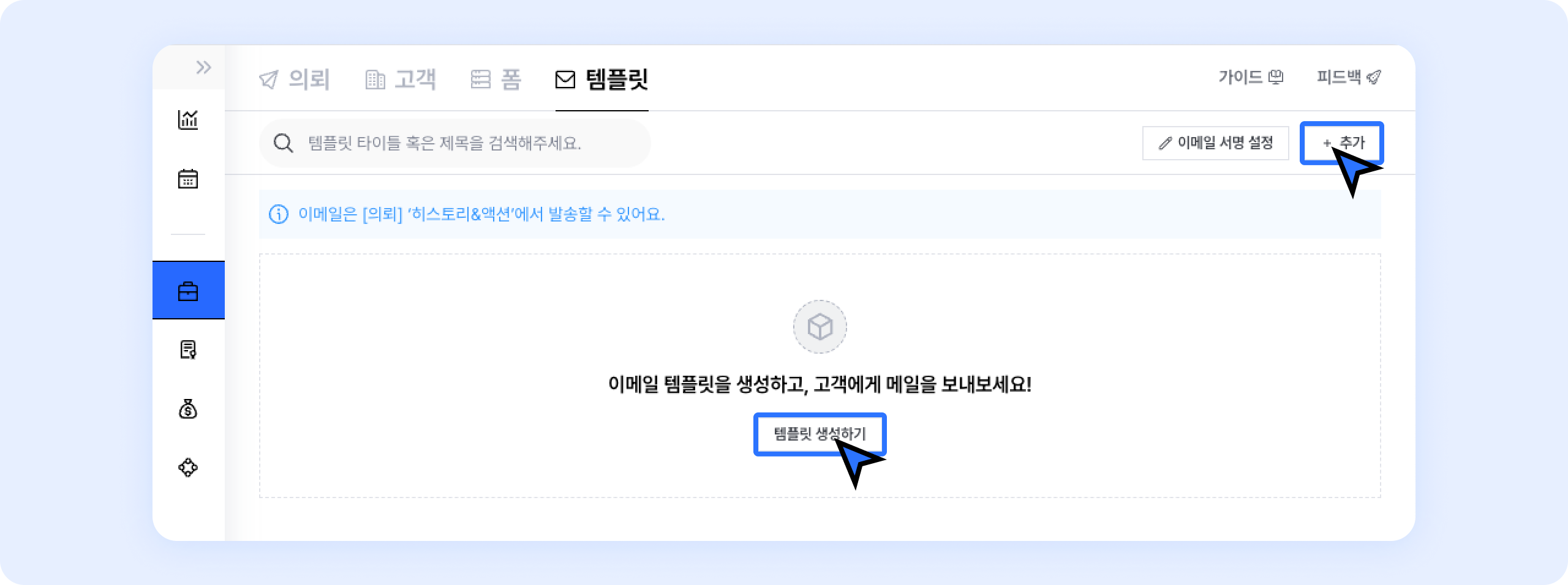 세일즈 > 템플릿 페이지에서 + 추가 버튼 또는 템플릿 생성하기 버튼을 클릭하세요.