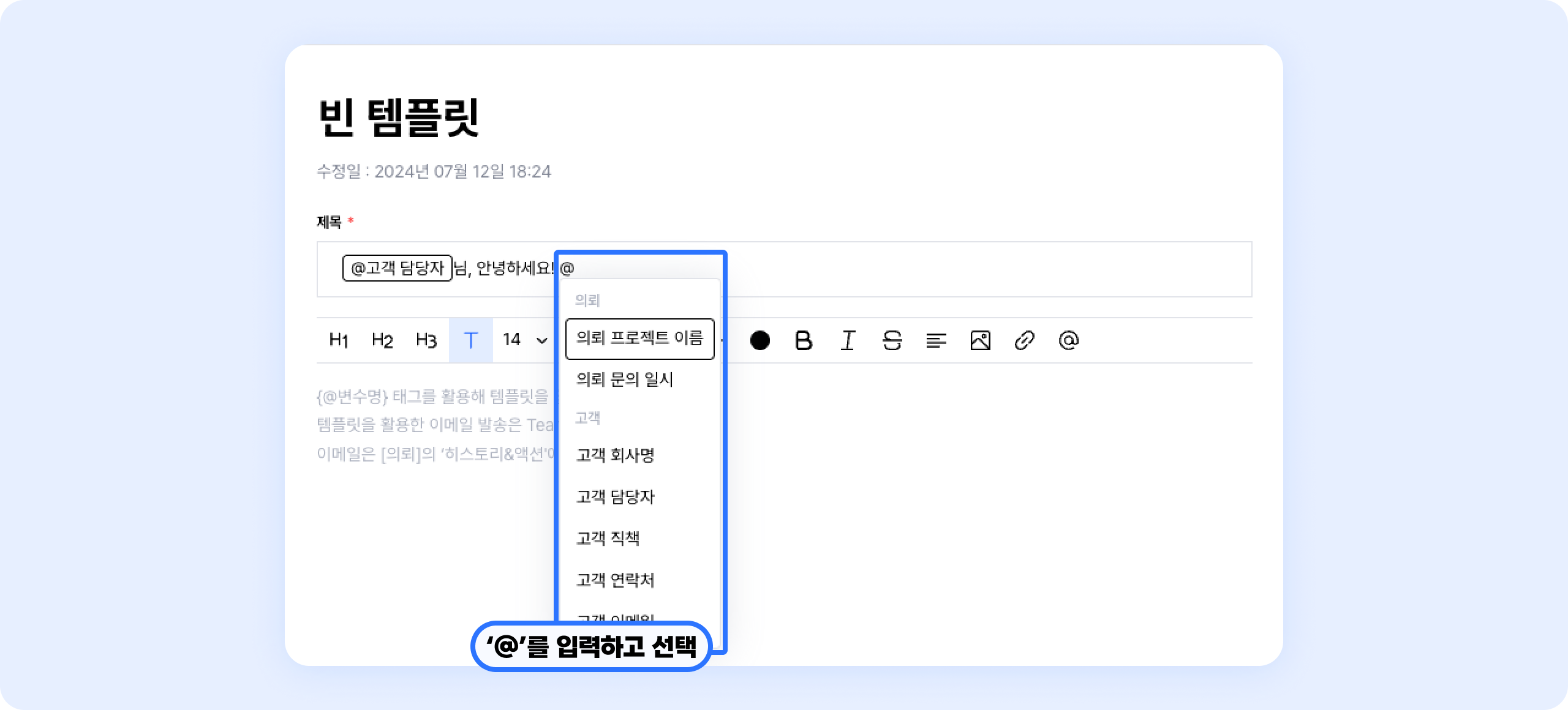 @를 입력하면 변수를 선택할 수 있는 화면이 나타나요.변수명 태그로 연결해두면, 의뢰에서 이메일을 발송할 때, 설정 부분이 자동으로 입력돼요.