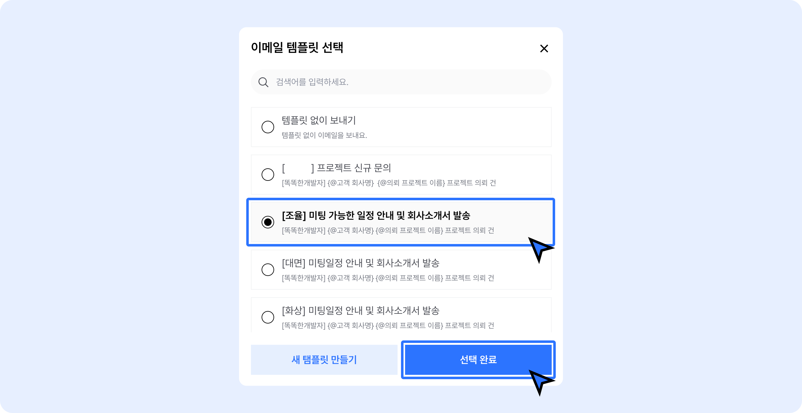 세일즈 > 의뢰 페이지안에서이메일을 클릭하면,템플릿을 선택할 수 있는 화면이 나타나요.해당 화면에서
