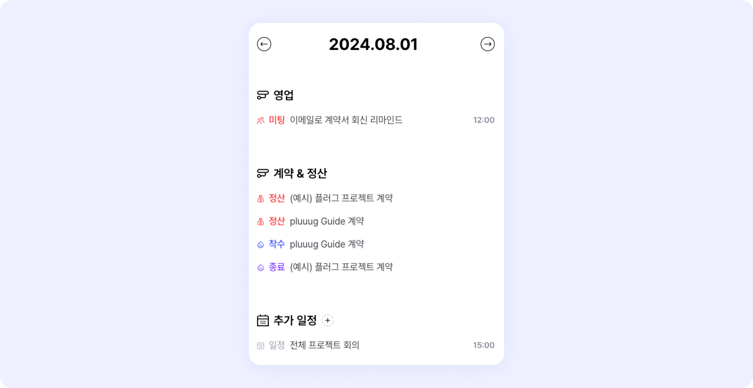 플러그의 캘린더는 '자동 일정'과 '추가 일정'으로 구분돼요.