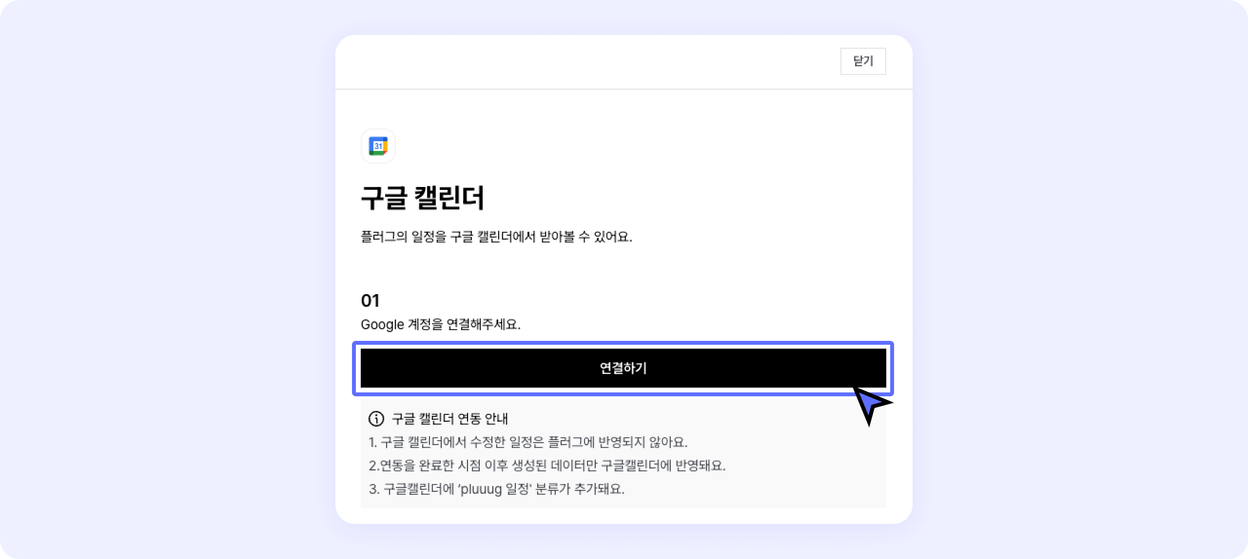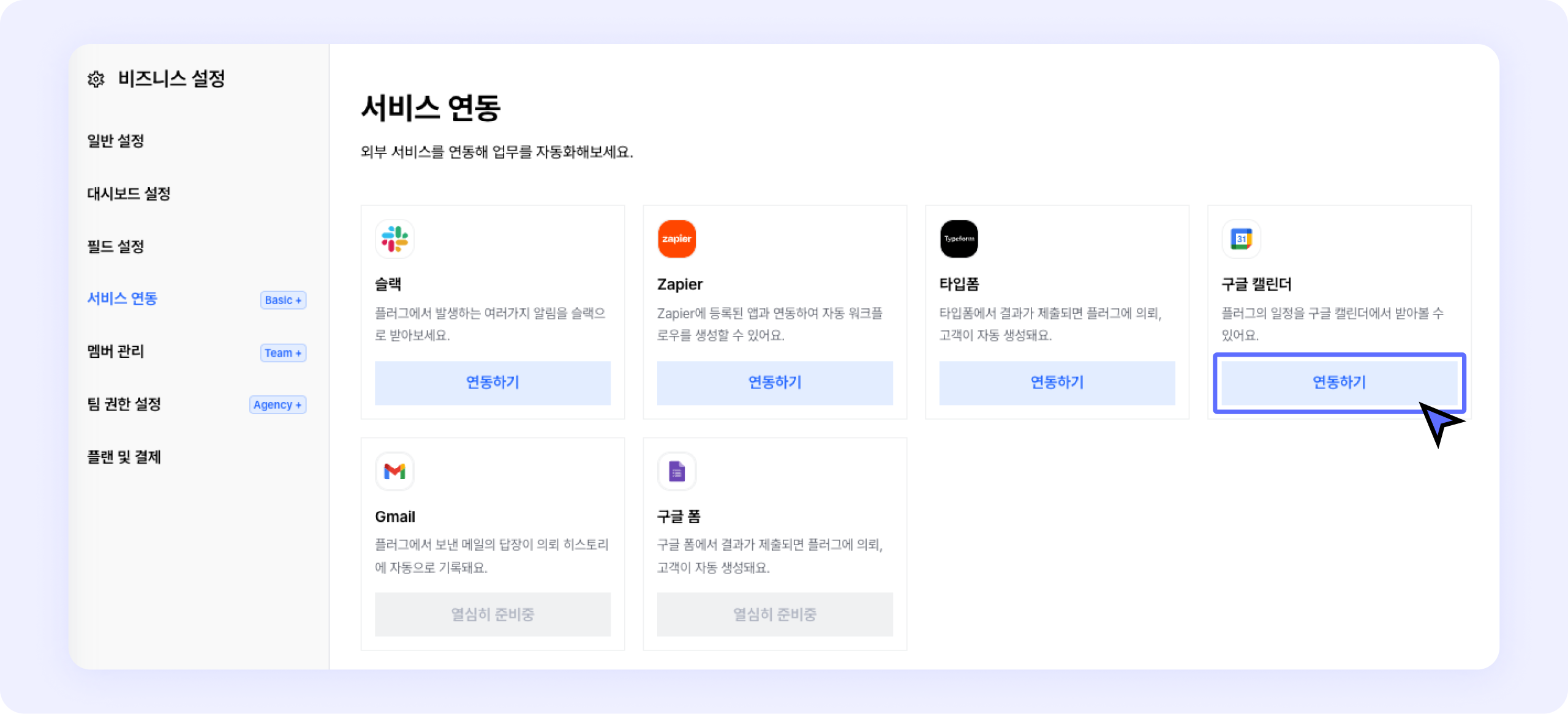 구글캘린더 연동 기능은 Basic 플랜 이상부터 사용할 수 있어요.