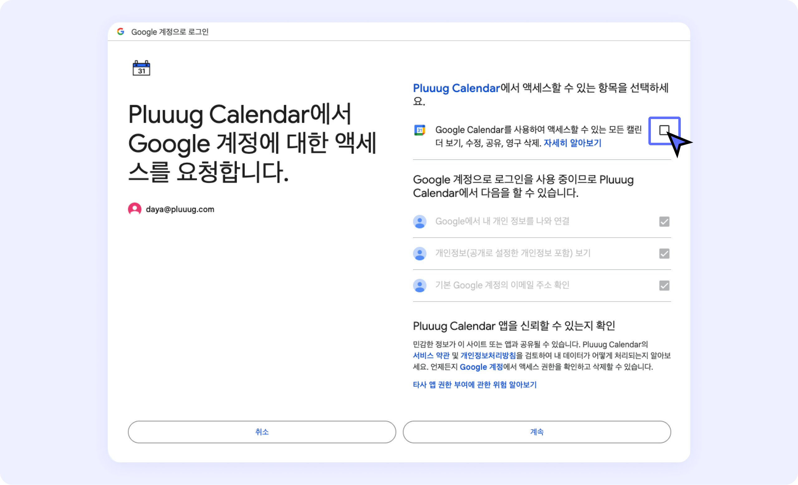 구글 계정을 클릭한 후, 캘린더 권한을 반드시 체크한 뒤,