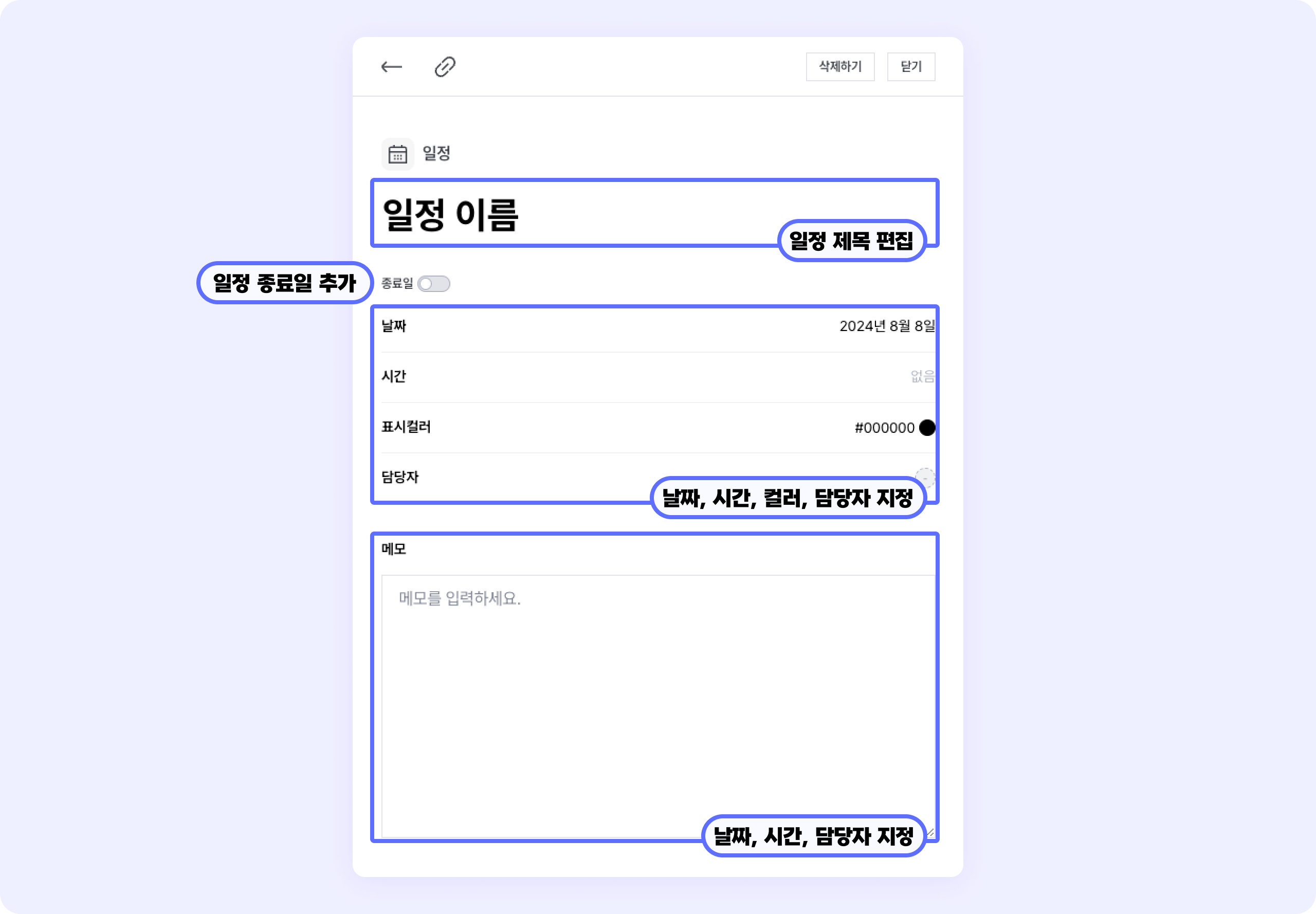 추가 일정에서 제목, 날짜, 시간, 담당자, 메모 등 내용을 편집하세요.