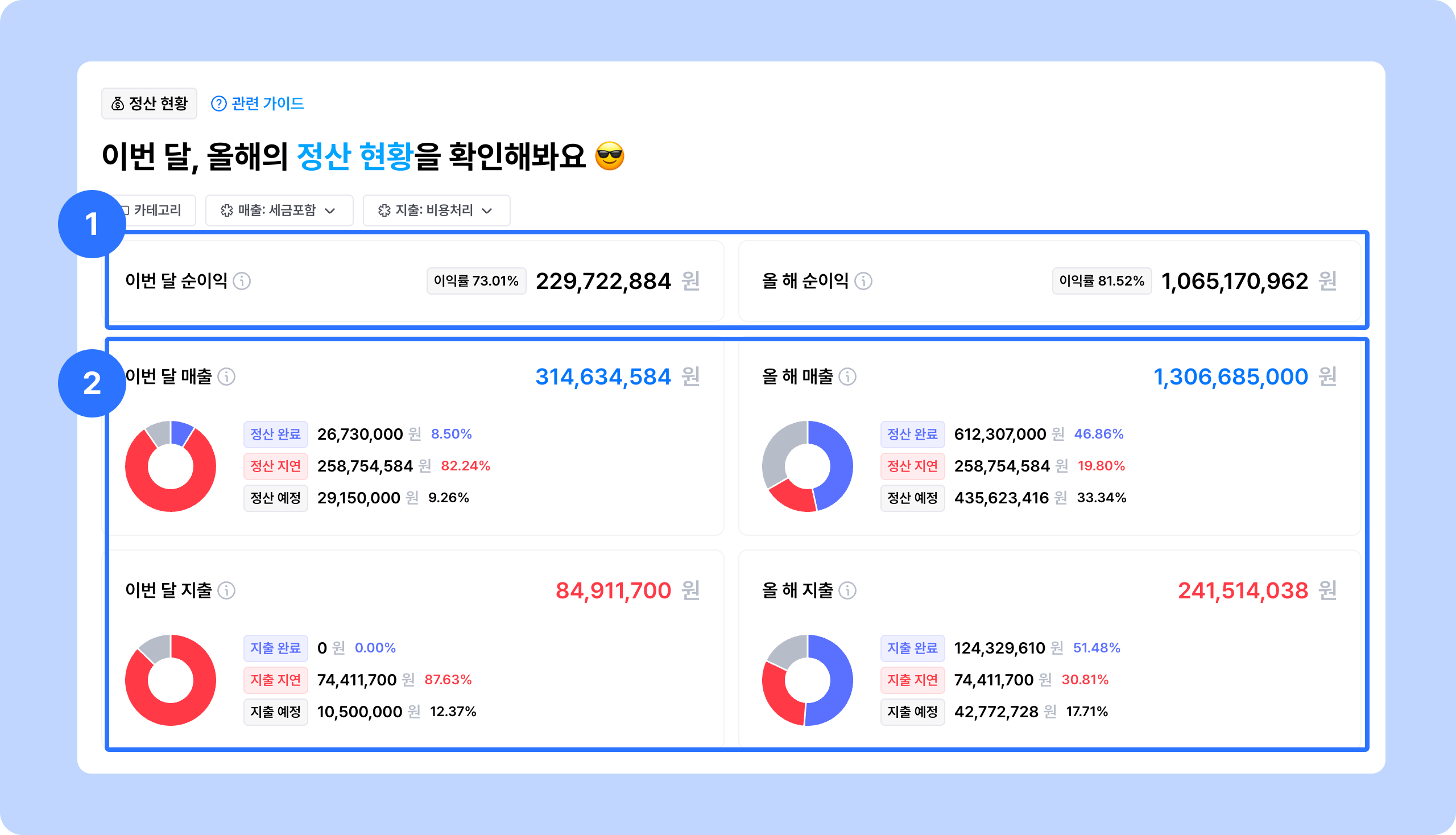 ① 이번 달, 올 해의 순이익 금액과 이익률을 확인할 수 있어요.