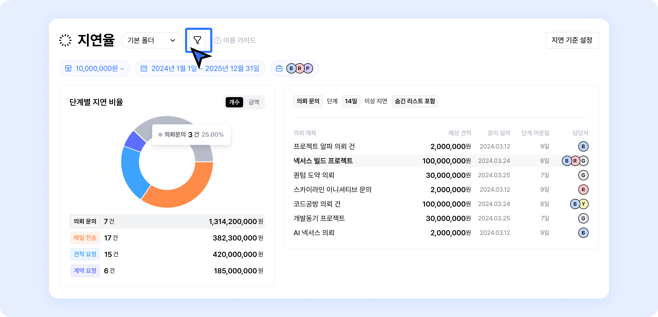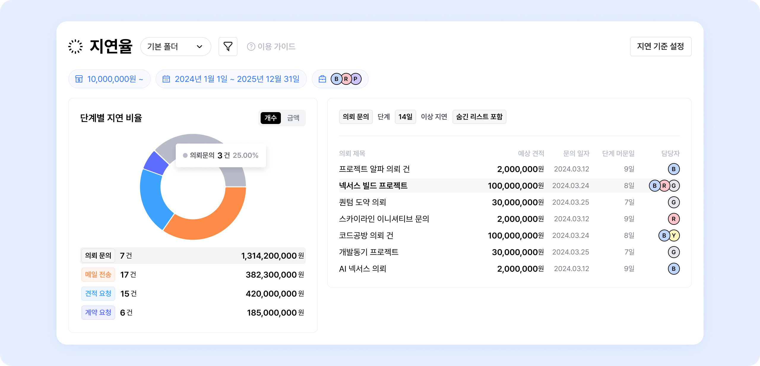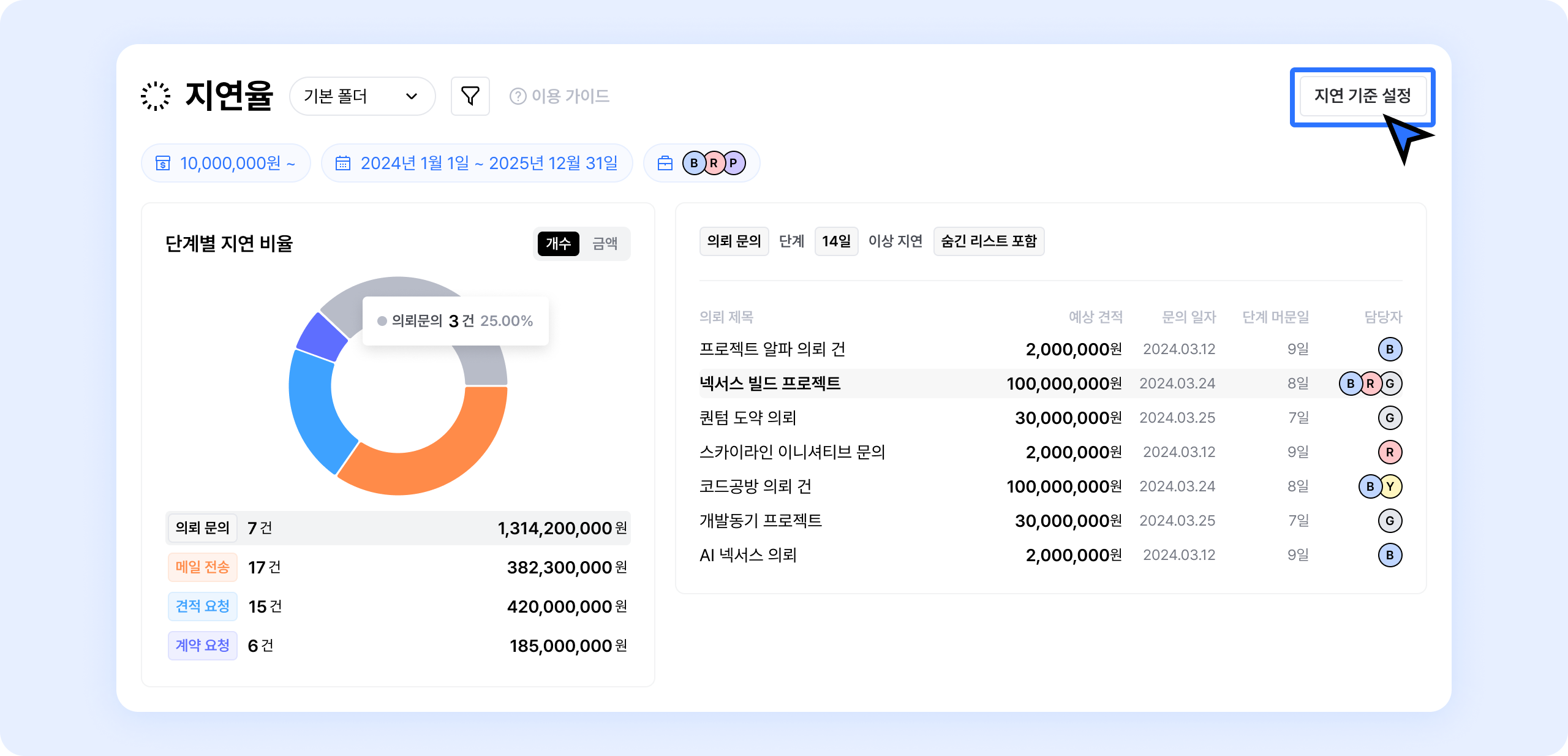 세일즈 > 의뢰에서 체크되는 머문기간에 따라 현재의 영업 지연율을 표시하는 기능이에요.