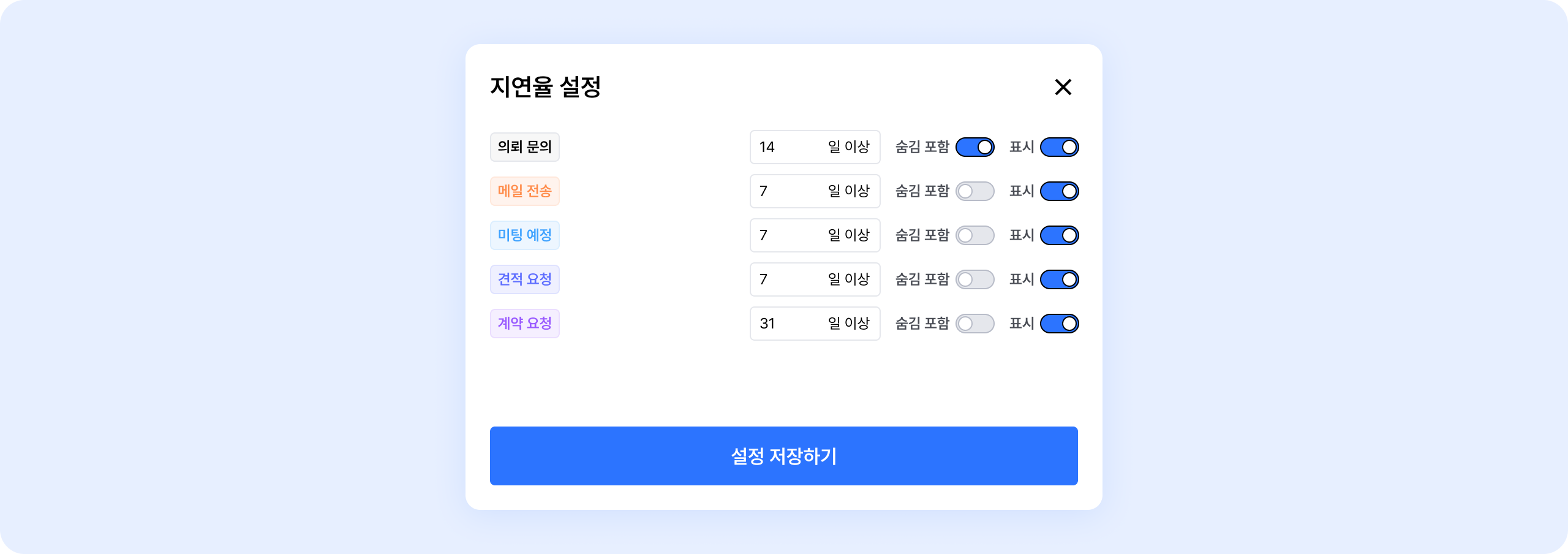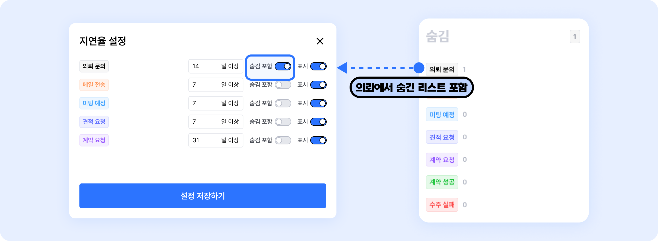 의뢰 리스트에서 '숨김'으로 설정한 건들을 지연율에 포함할 것인지 설정할 수 있어요.