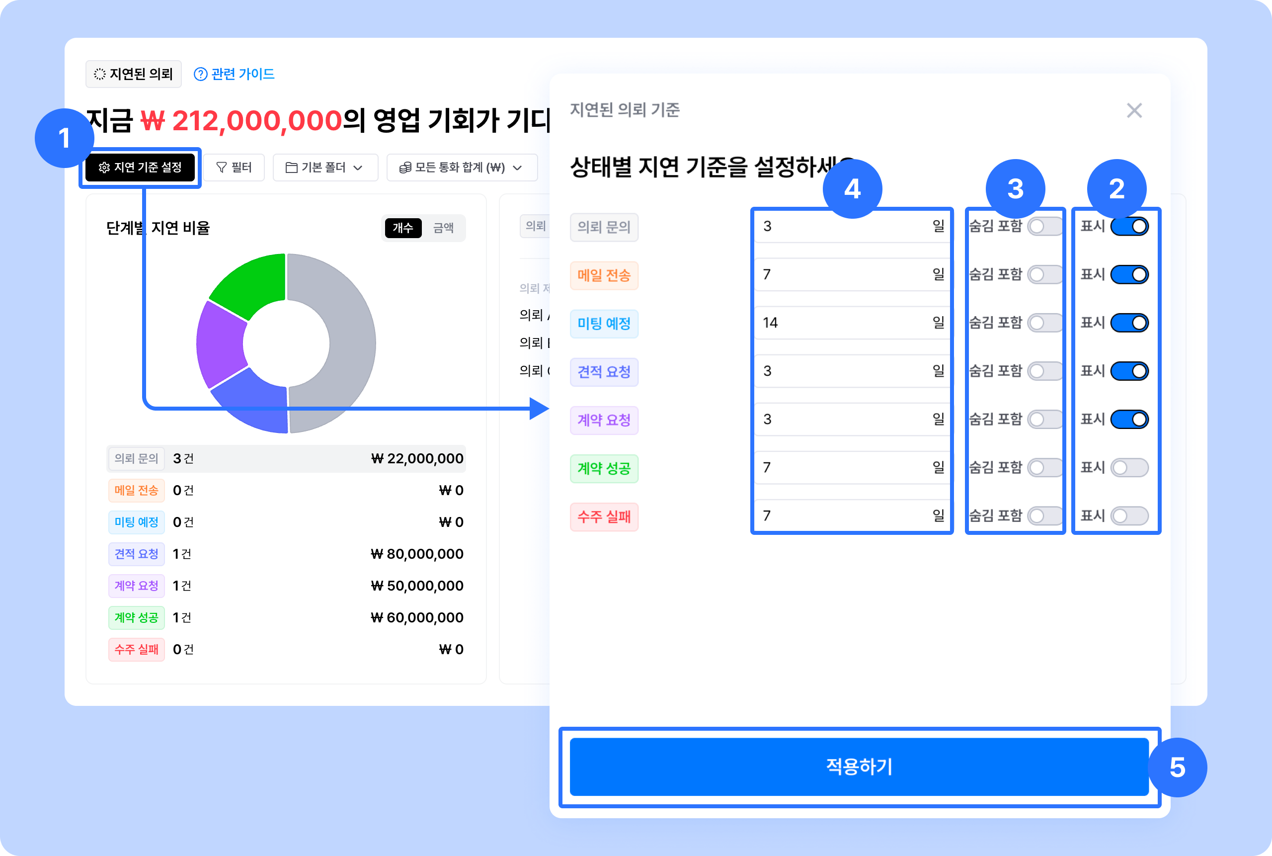영업 파이프라인 단계 설정이 끝났다면, 각 단계별 지연의 기준을 설정해야해요.