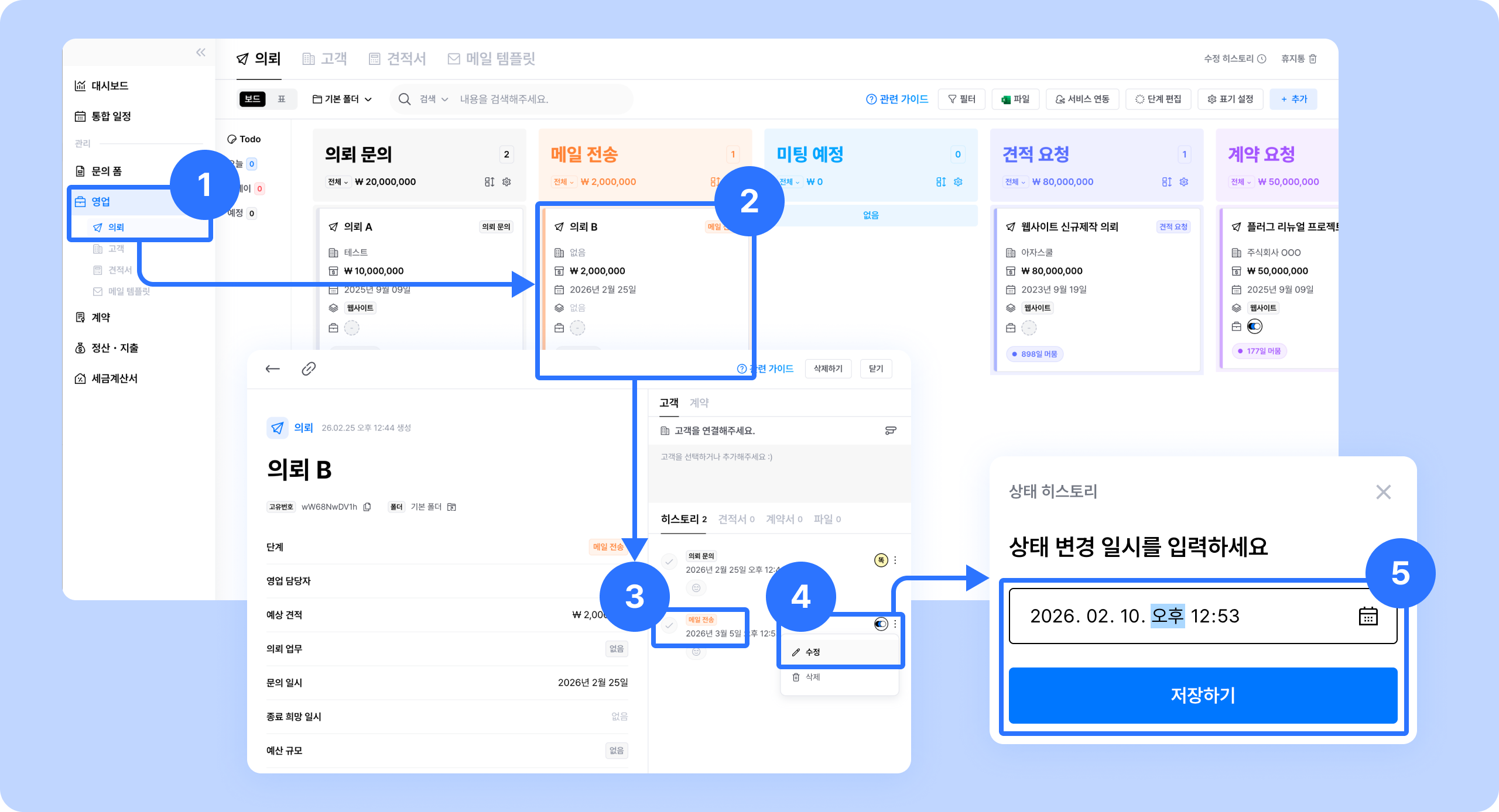 현재 지연된 의뢰를 확인할 수 있게 되면, 새로운 기회로 만들어낼 수 있어요. 리스트로 바로 들어가 지난 히스토리를 확인하고, 왜 지연되었는지, 더 연락할 기회를 만들어볼 수 없는지 점검해보세요. 영업 Todo 기능이메일 예약 발송 기능을 함께 활용하면 더욱 효율적이고 전략적으로 영업을 이어나갈 수 있어요.