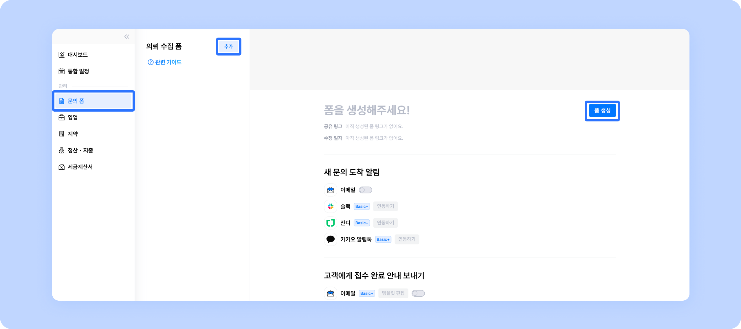 ① 문의 폼 > [추가] 또는 [폼 생성] 버튼을 클릭하세요.