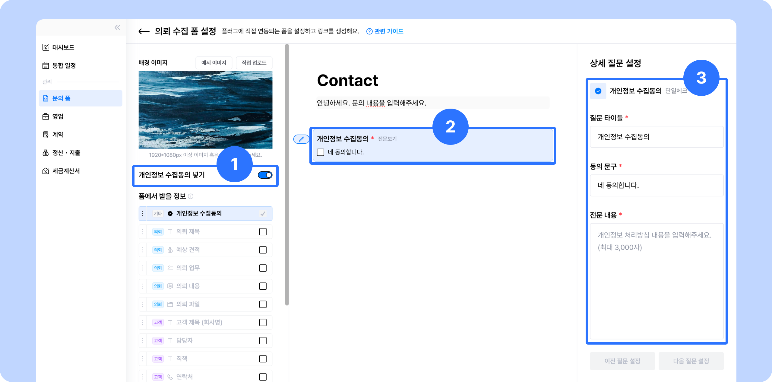 ① [개인정보 수집동의 넣기] 토글을 활성화하세요.