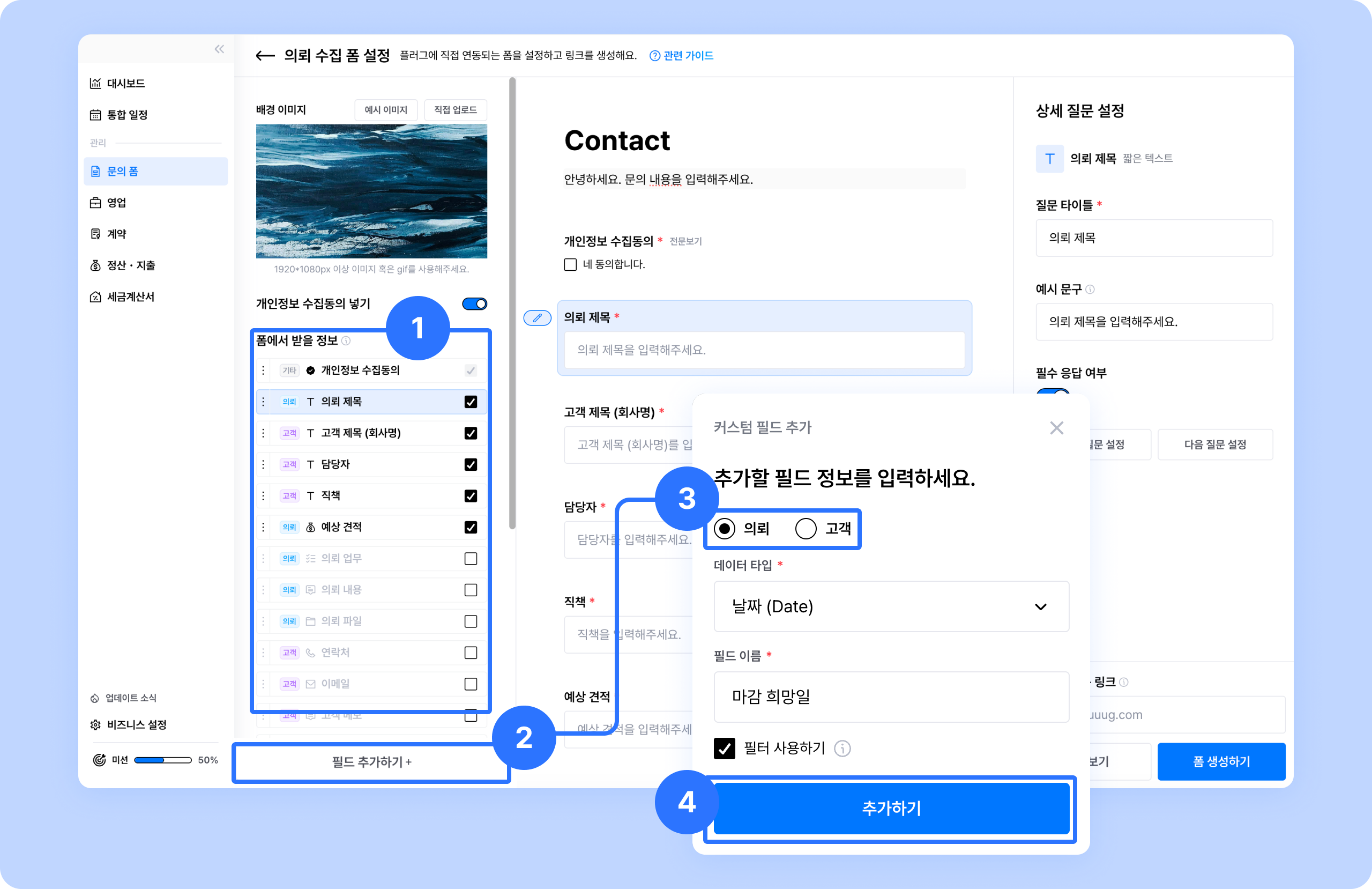 플러그에서 관리하는 [의뢰]와 [고객] 정리 양식(필드)을 기준으로 질문을 추가할 수 있어요.