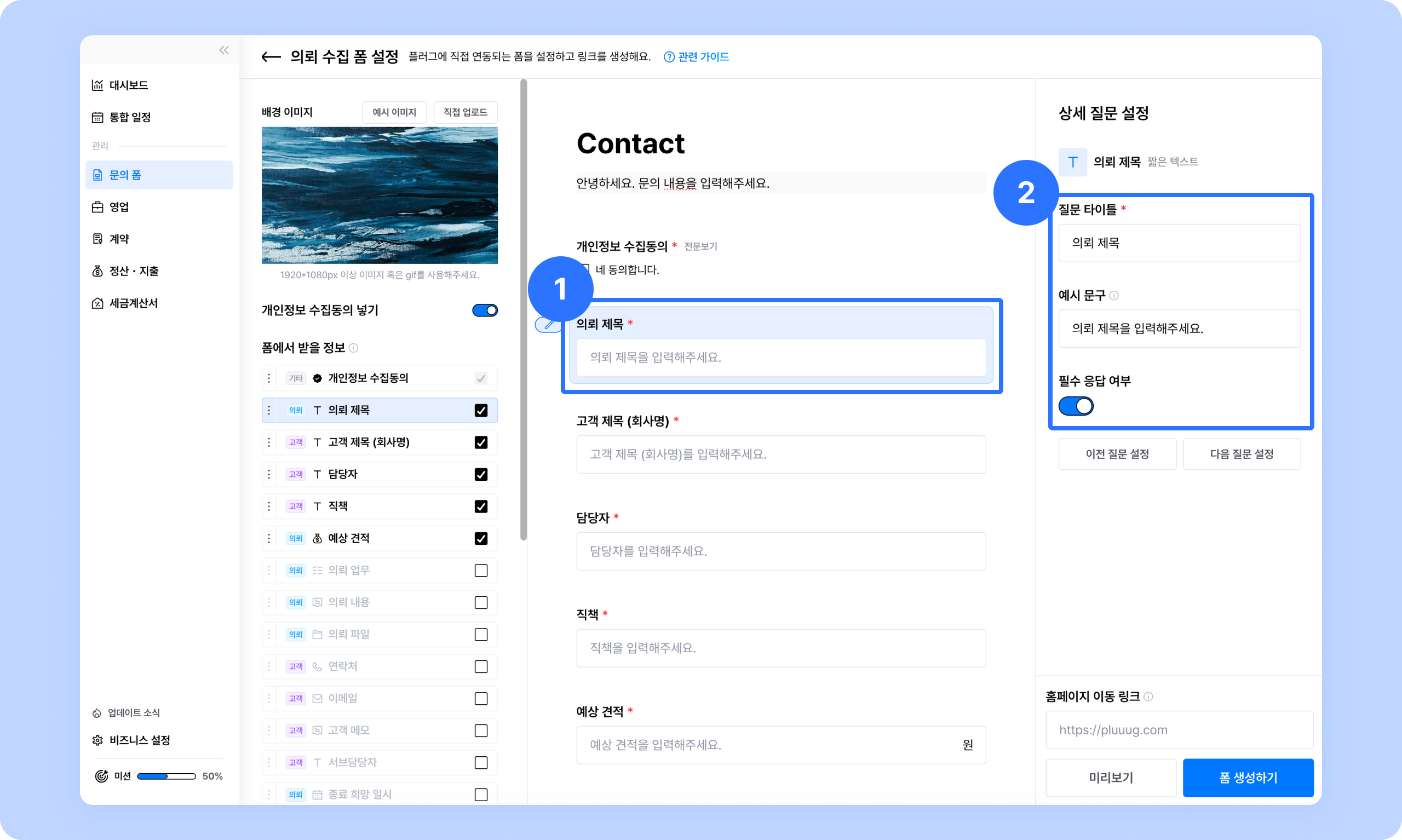 ① 좌측 [폼에서 받을 정보]에서 고객이 입력 해야하는 정보들을 체크하세요.