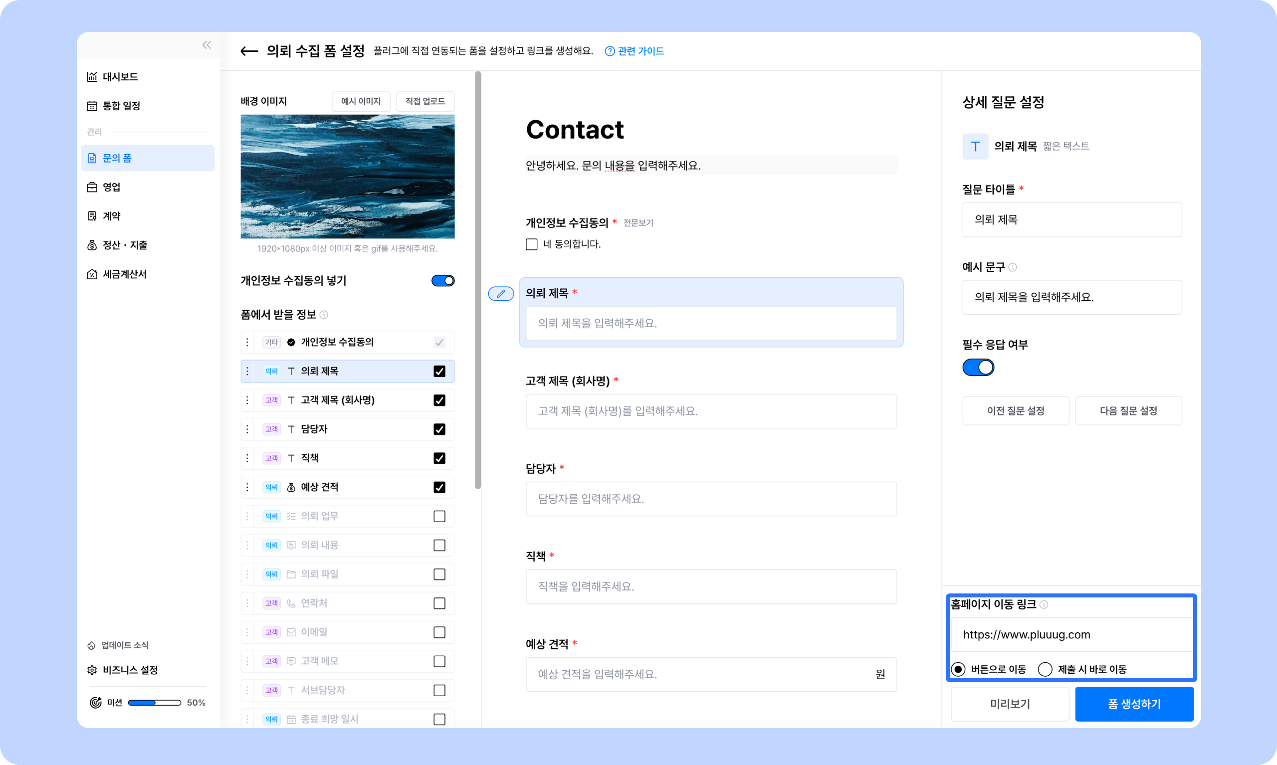 고객에게 정리된 형태로 문의를 받아 누락되는 정보가 없게하고, 별도로 정리하는 시간을 아끼기 위해 [폼] 기능을 활용해요. 플러그는 신규 영업 건과 고객 관리에 이어서 계약, 정산 수금 관리까지 이어지기 때문에, 문의를 받는 시작점인 [폼] 기능이 문의 수집과 정리를 자동화할 수 있는 장치가 돼요.