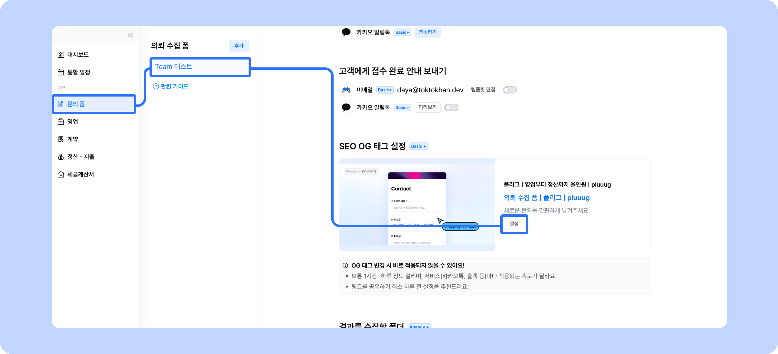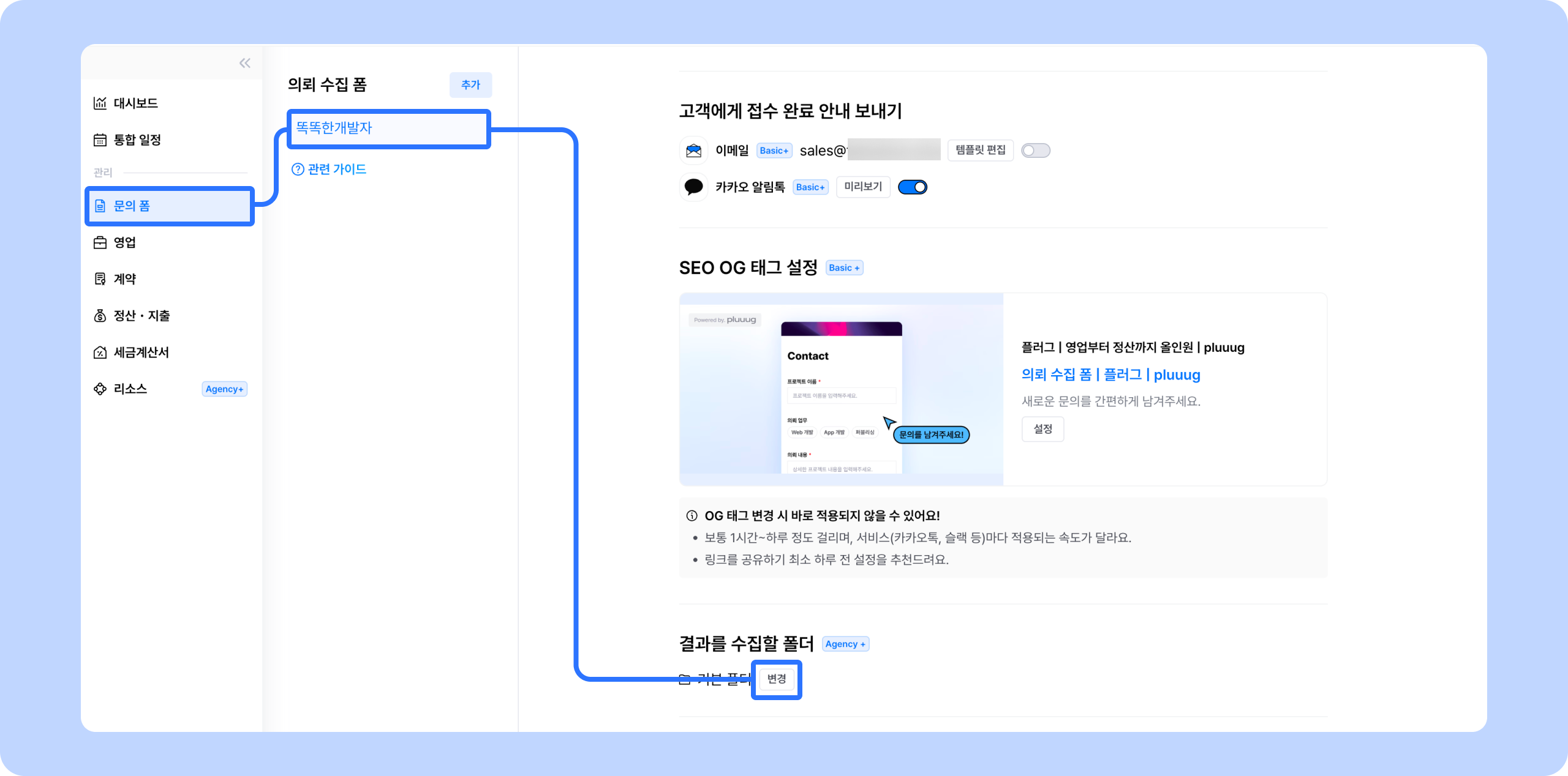 이 폼에서 문의가 제출됐을 때 어떤 의뢰 폴더로 쌓이게 할 것인지 설정할 수 있어요.