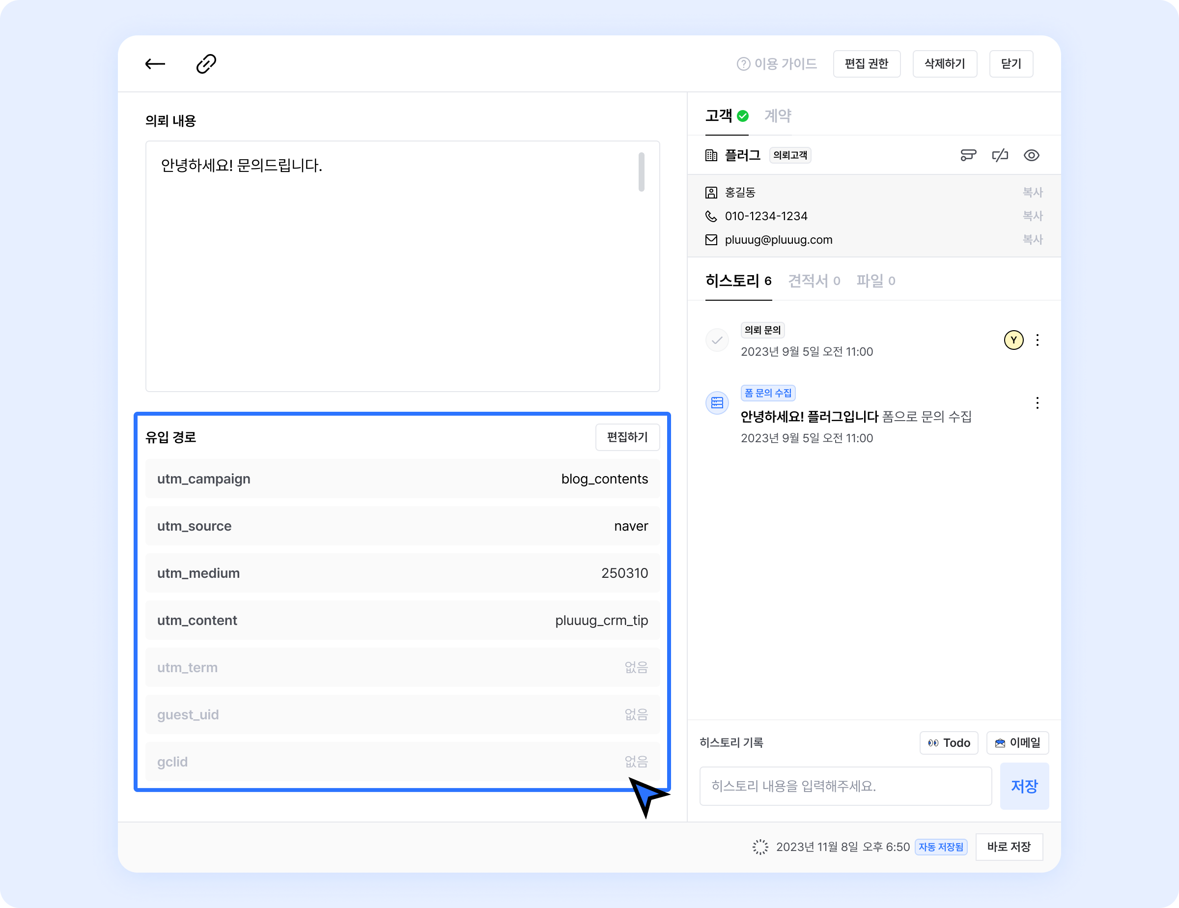 폼으로 제출된 의뢰에 유입 경로가 감지되면 자동으로 수집돼요.