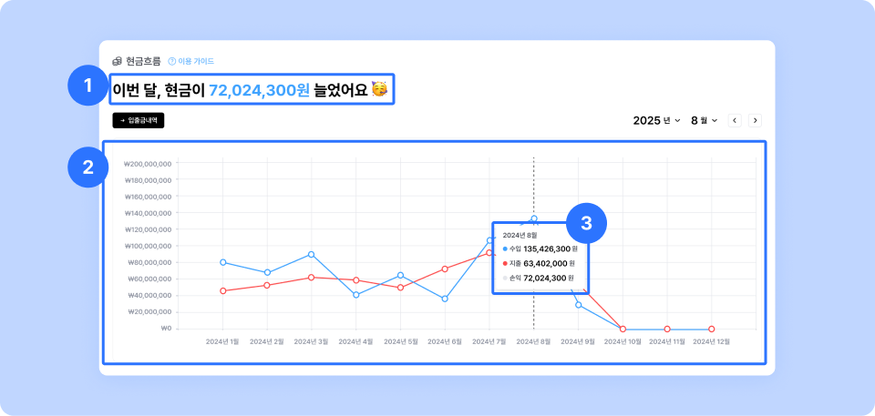 현금흐름 대시보드는 각 월별 총 입금액과 출금액을 기준으로 손익 금액을 확인할 수 있어요.