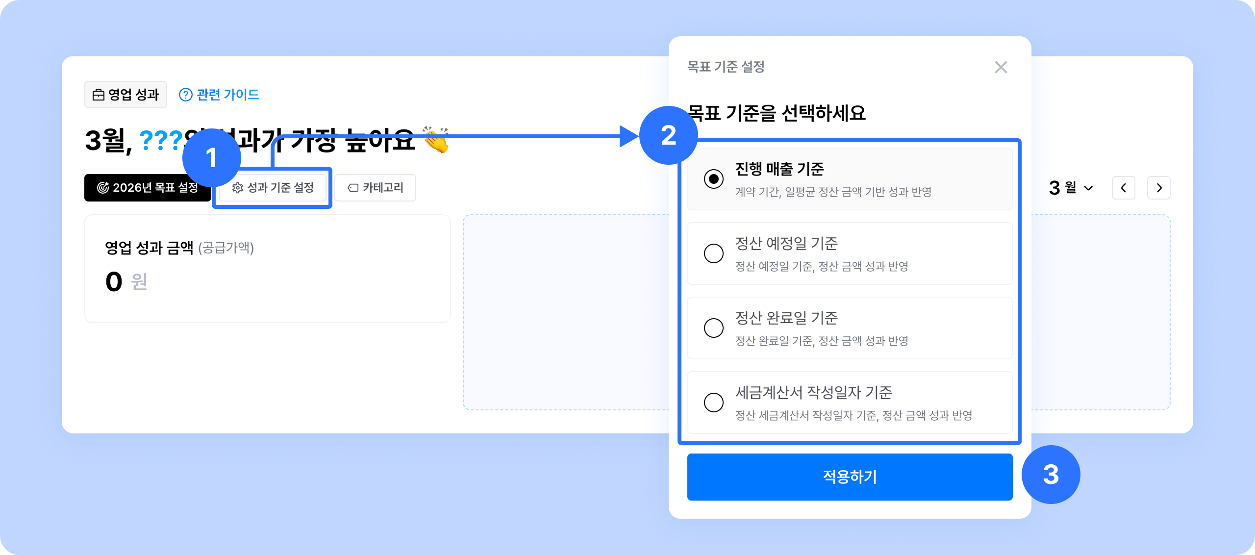 ① 대시보드 > 영업 성과 > [성과 기준 설정] 버튼을 클릭하세요.