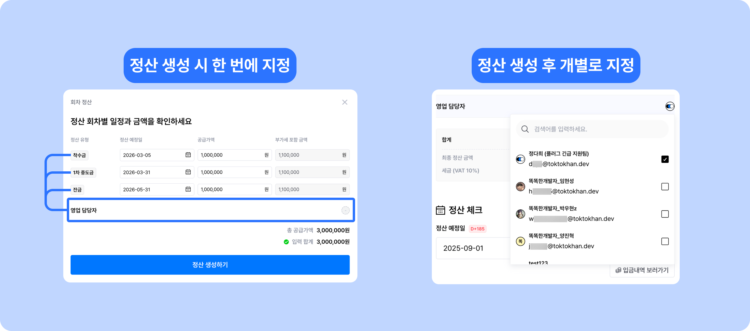 정산 생성 시, 하단의 '영업 담당자'에 멤버를 지정하면, 생성하는 모든 정산의 영업 담당자가 선택한 담당자로 등록돼요.