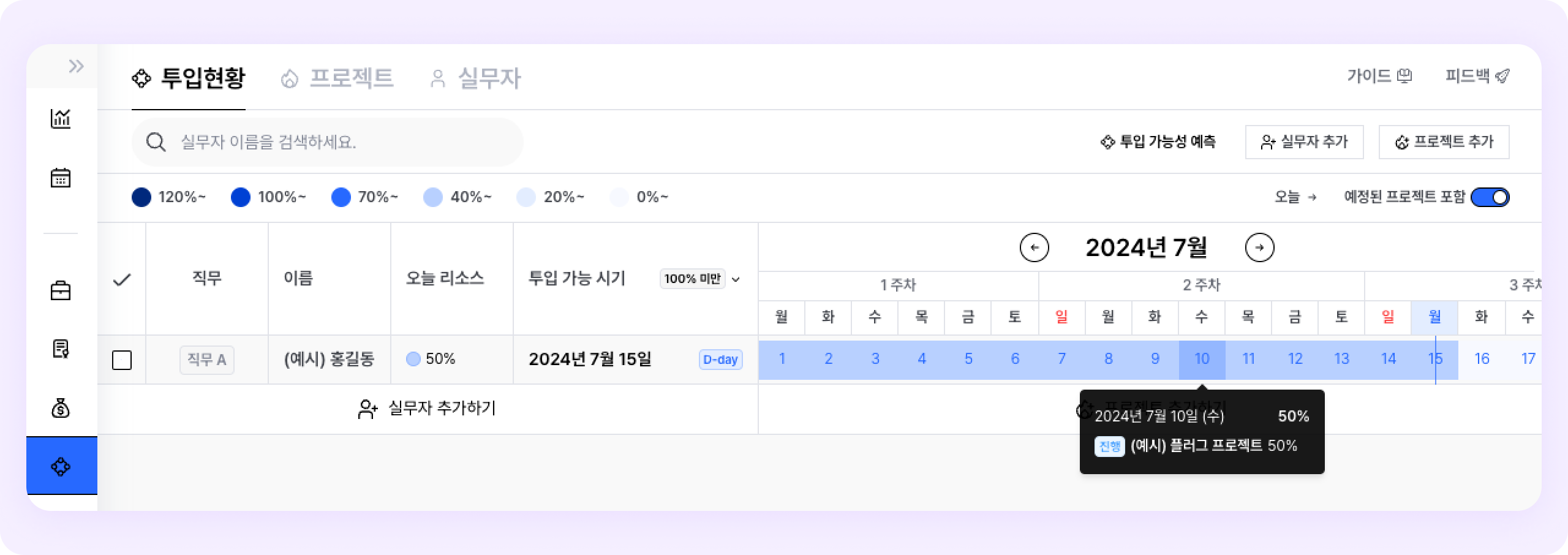 실무자별 투입 정보를 한 눈에 확인할 수 있어요.